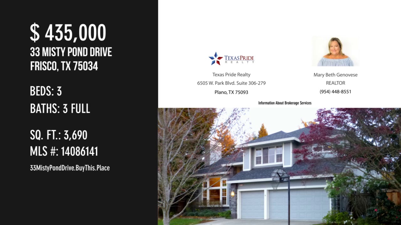 Wonderful opportunities wait you in this spacious 3 bed 3 bath home with a study, private courtyard and more. The kitchen features gas cook top, loads of cabinets, double oven and Samsung French door SS fridge. Open to living and dining areas. Additional living area or game room, study and full bath downstairs. Everything in the master is large… large bedroom, oversized walk-in closet and gigantic master bath. Newer AC and tankless water heater. Located in Frisco’s much sought after Willow Pond gated community wit 6-hole Par 3 golf course, 3 private ponds, walking paths and serene waterfall. Super close to major shopping and dining. Easy access to 121 and DNT.