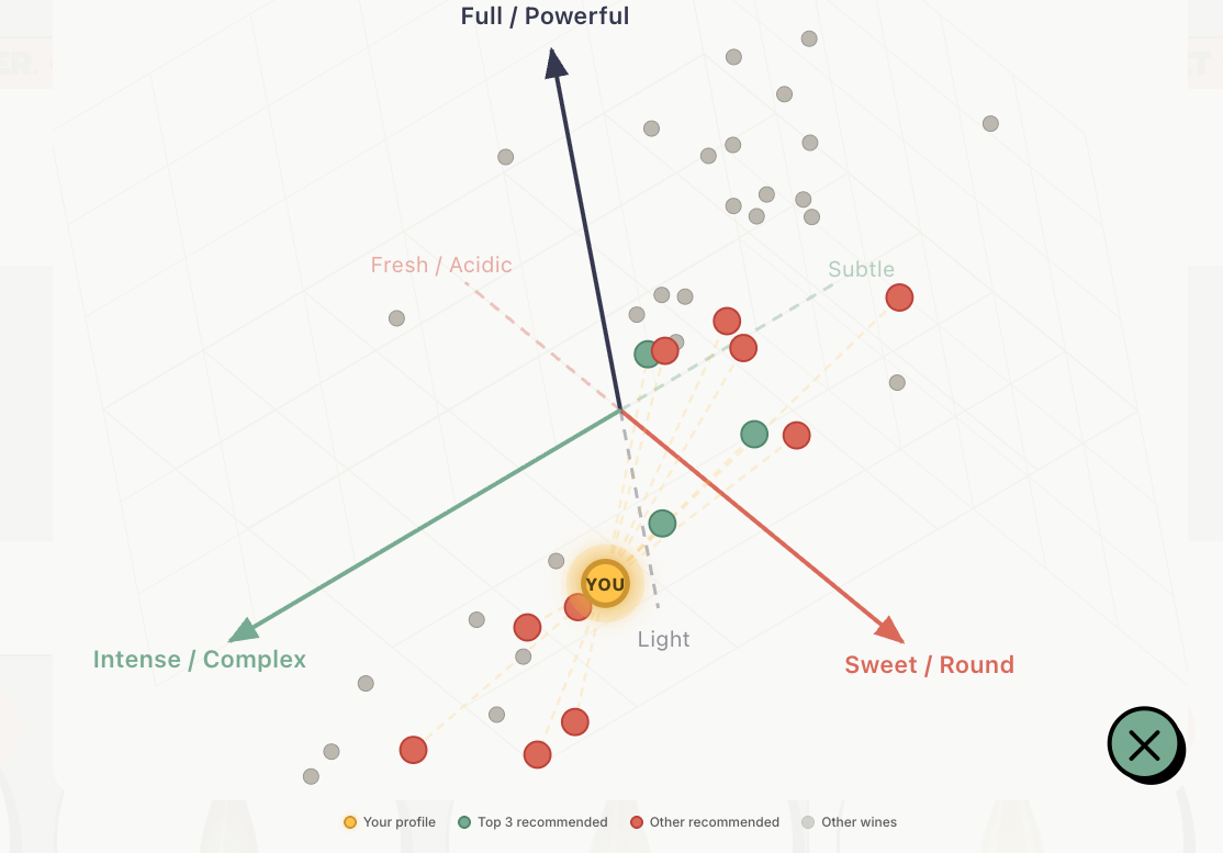 I recently launched vinpop.nl in the Netherlands to test this, and I’ve integrated a scatter chart (see image below) to help users visualize where a wine sits compared to their preferences from a quiz.