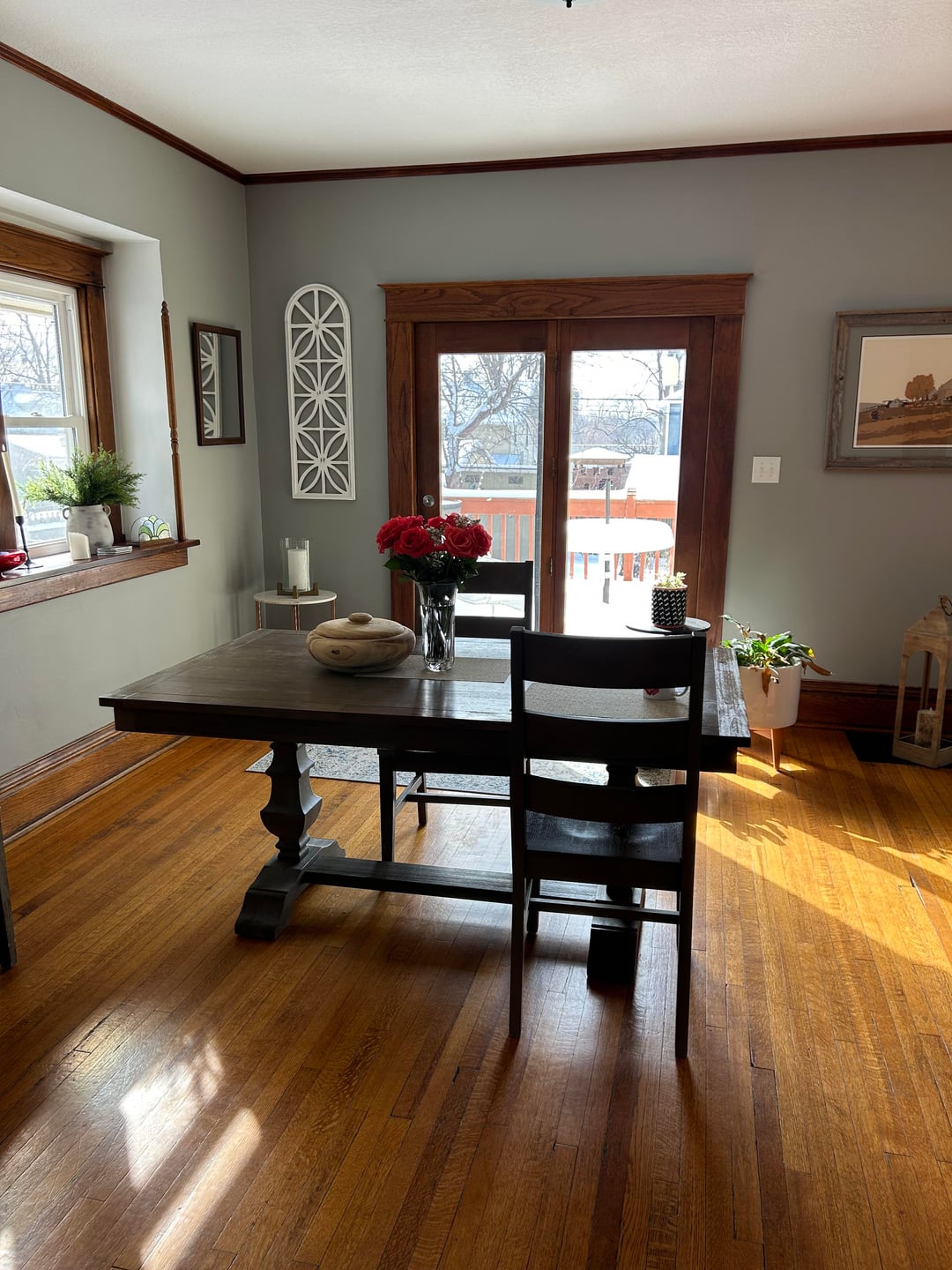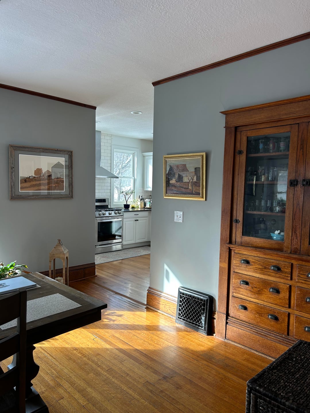 We remodeled our 115 year old Midwest home several years ago. We painted everything grey. I want a refresh, but have no idea what color to put with this woodwork. I don’t mind grey, but I know it’s dated. The art is staying (family art) and the woodwork is staying. I like minimal, calm, cozy. Suggestions?