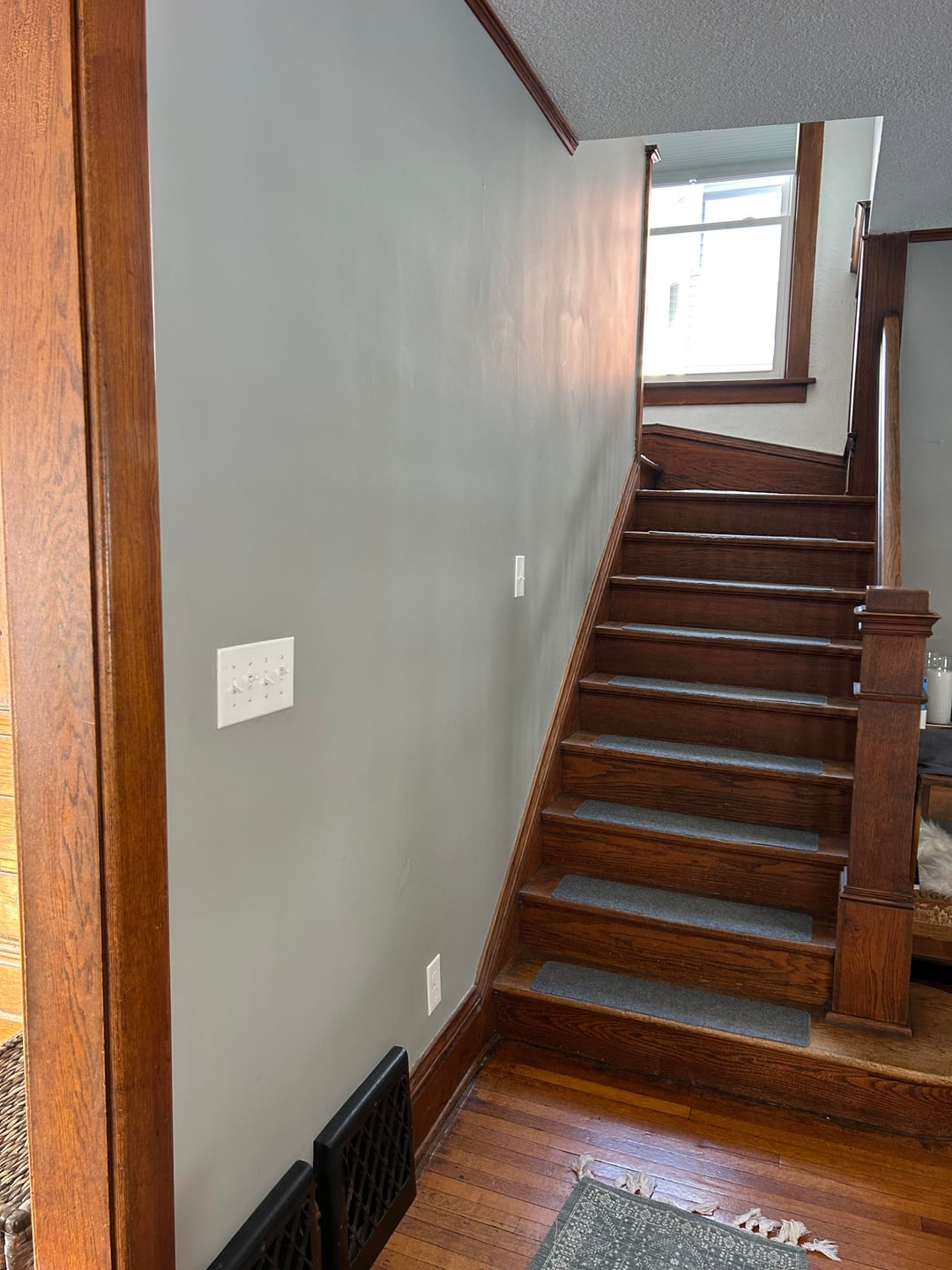 I like the grey,appears somewhat green and compliments the wood….maybe sage green in the stairwell and other areas…..we all do not have to abandon grey when some paint company or designer of the year says grey is “out”