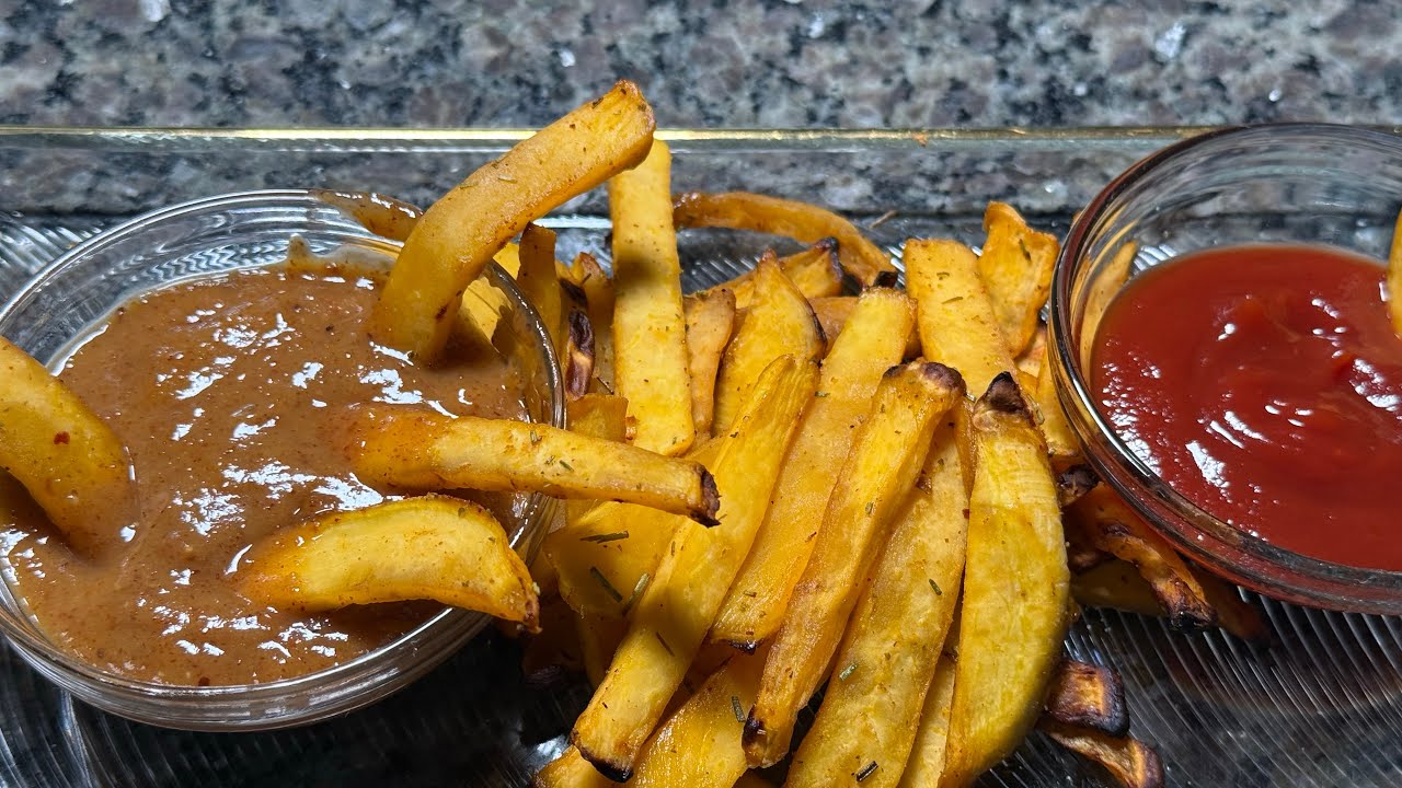 Rutabaga fries very impressive and nutritious 😋👏👌 Air frying is cool. Golden brown just like that with ketchup on the side. Nice substitution!!