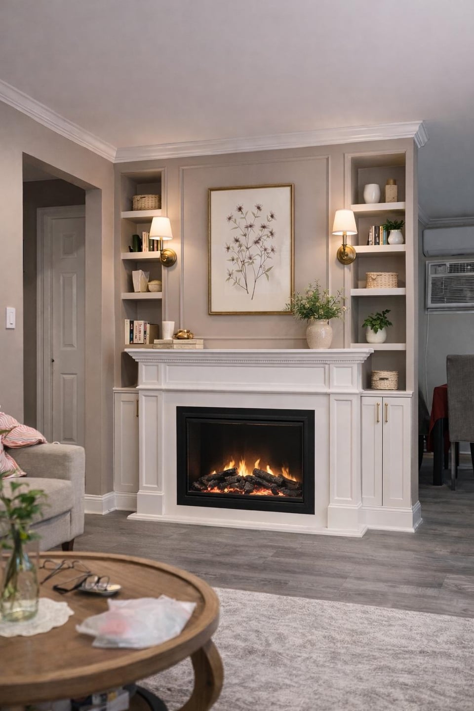 Fireplace with shelves but eliminate sconces