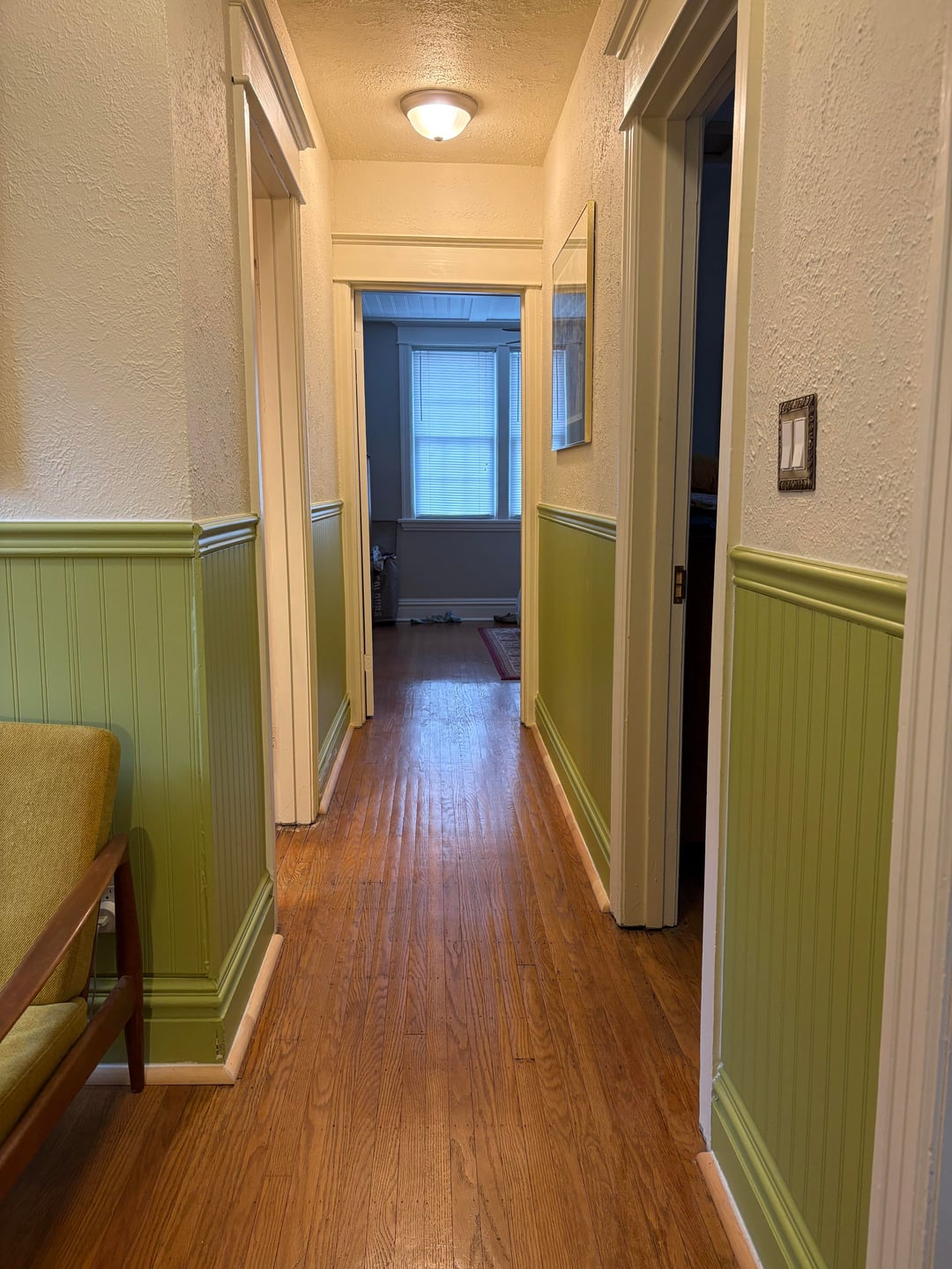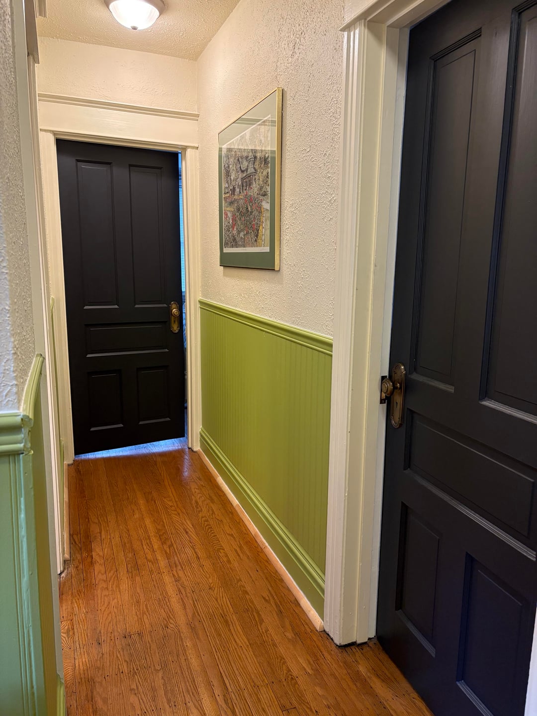 Just finished adding new quarter round to the bottom, and torn between keeping the wainscotting this green colour, or painting it. We painted the doors dark recently, and I don’t love them with the green- but they are never really closed so I don’t necessarily want to make the decision based on that?