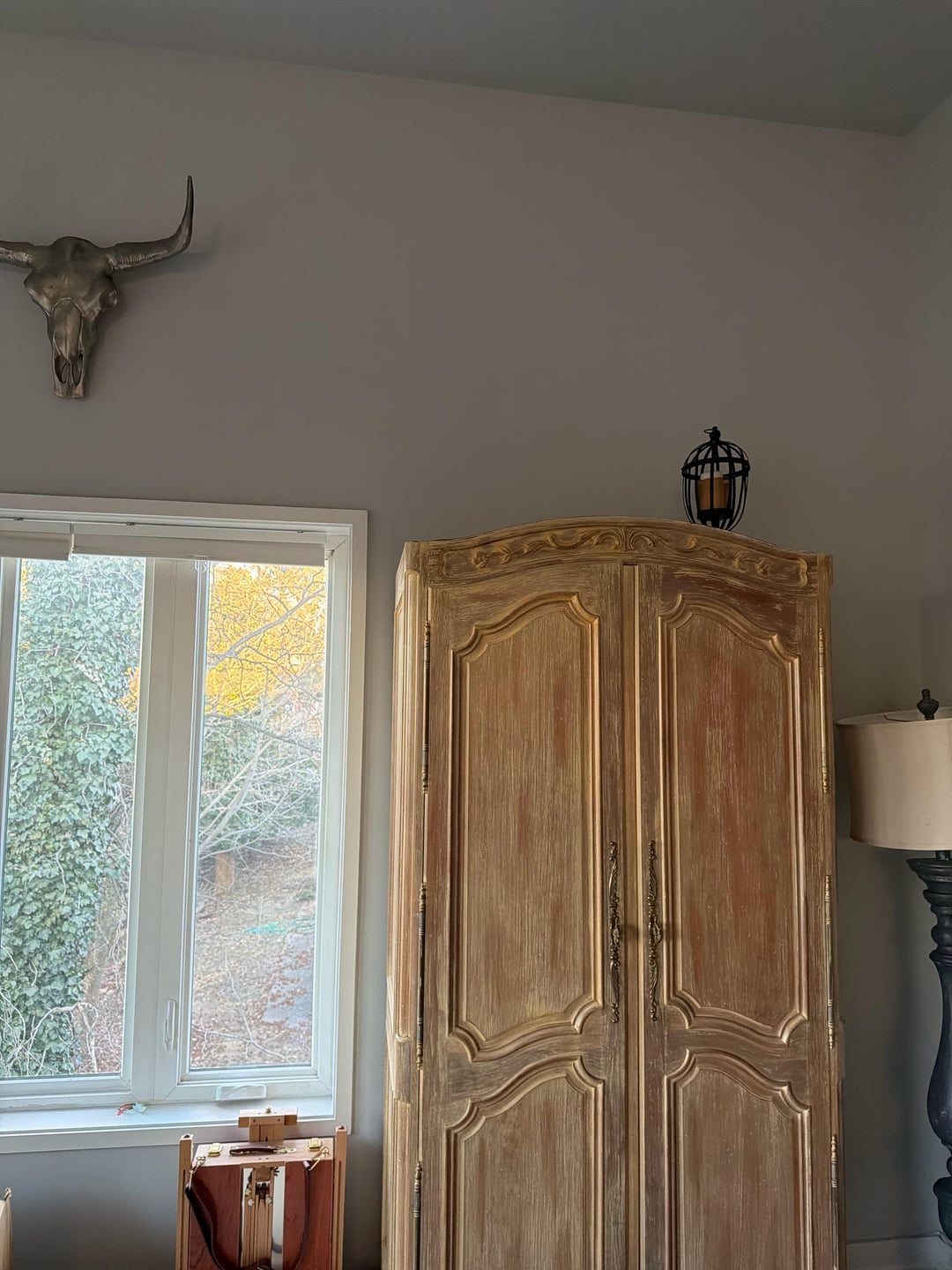 I love the country French farmhouse feel, with a hint of darkness. I feel the corner on the left looks empty and awkward.