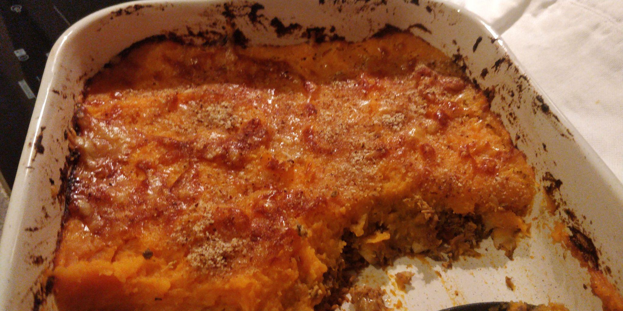Patate douce cuite à l’eau, écrasée avec de la crème fraîche. Un peu d’emmental râpé et de chapelure produite avec un quignon de pain rassis grillé, et voilà.
