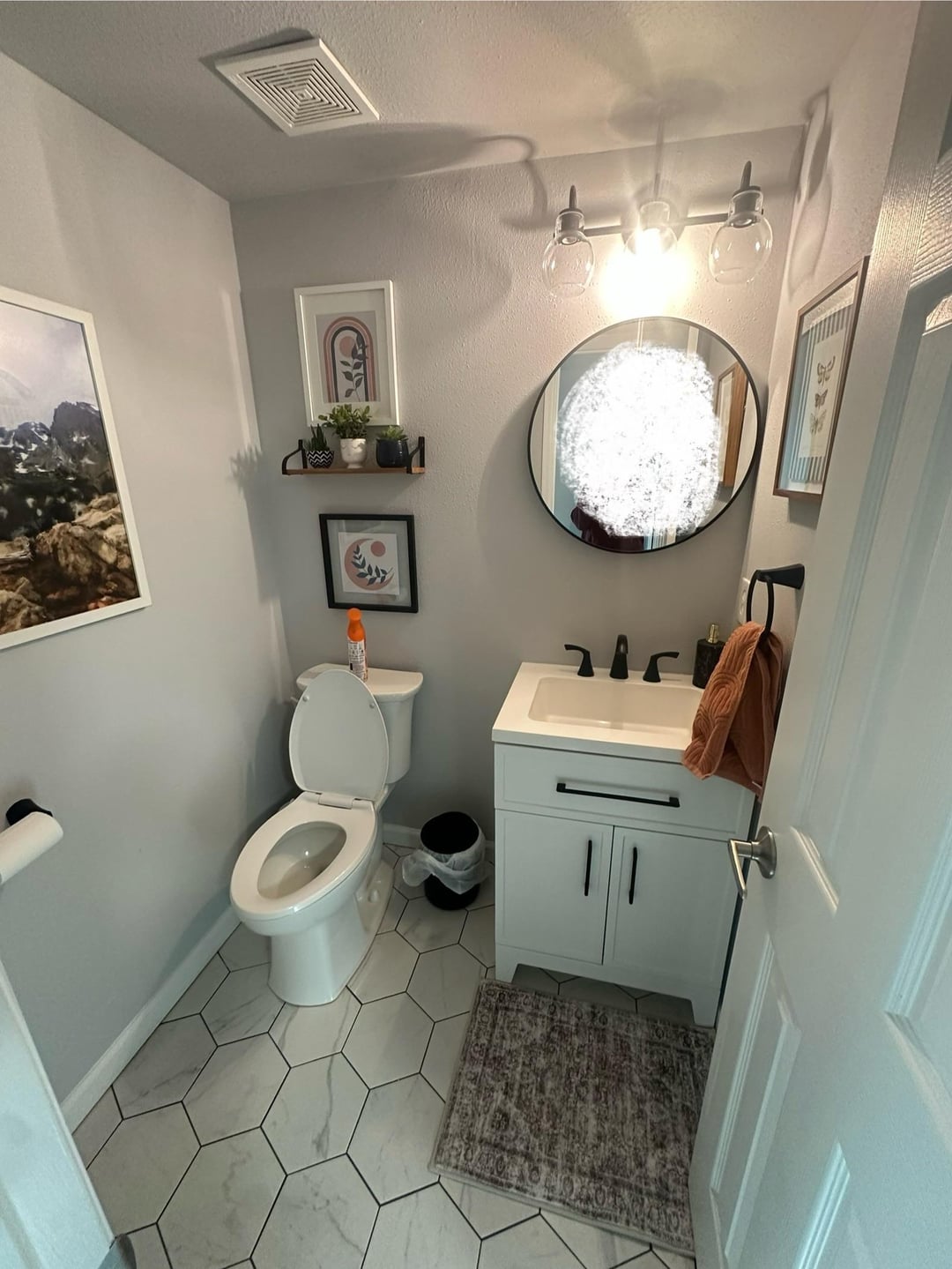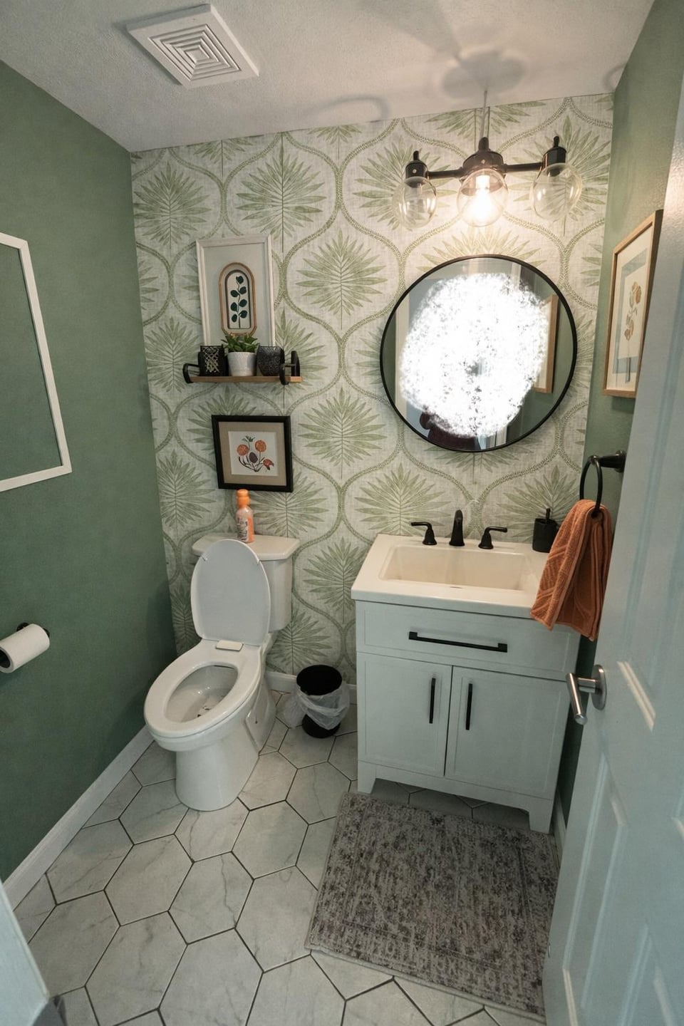 I’d love your help picking the design for my half bath. We’re unable to change the any of the flooring or fixtures, but might be able to paint the vanity.