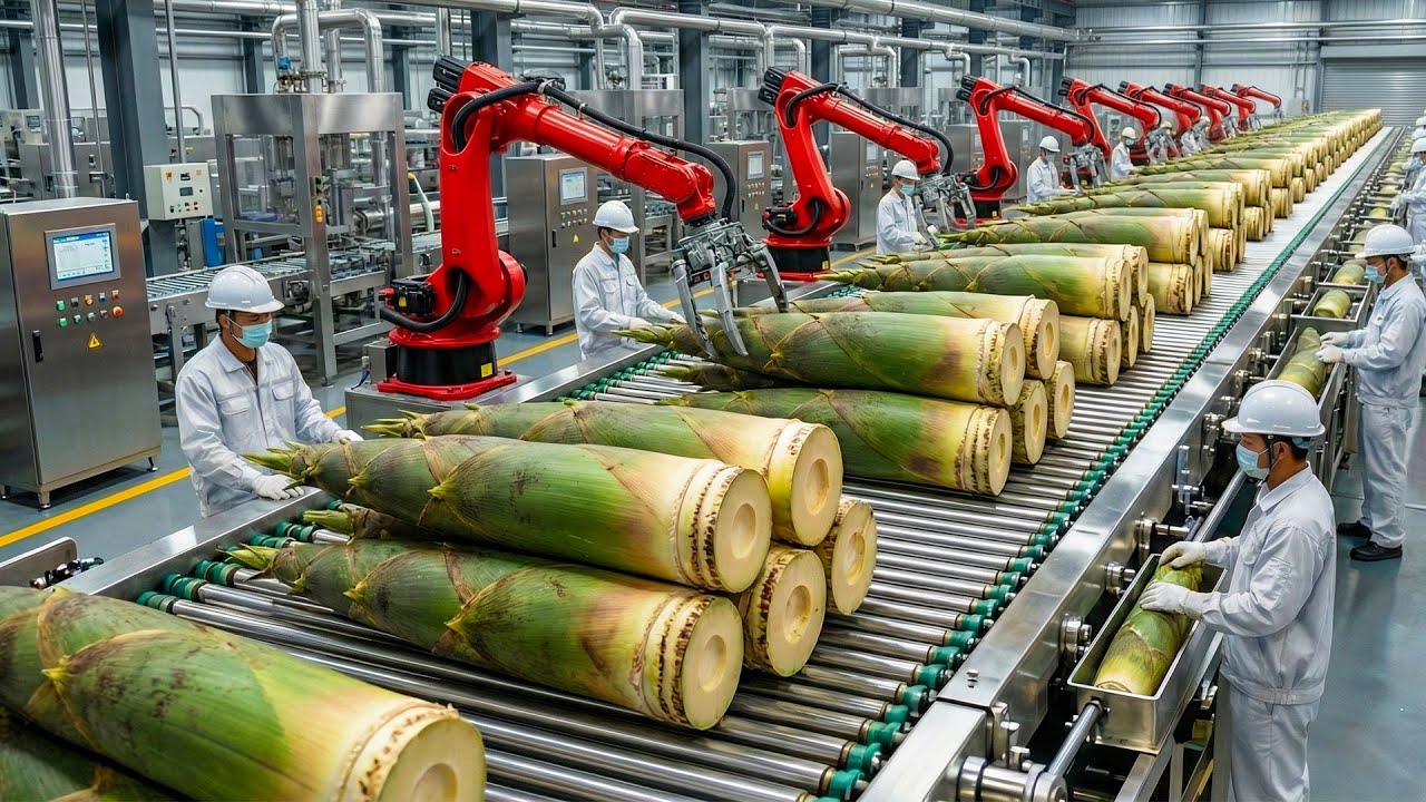 Step inside a 500,000 LB bamboo shoot processing plant and witness the terrifying yet mesmerizing peeling process behind modern gourmet bamboo shoot production. This documentary-style video takes you deep into a high-capacity industrial facility, revealing how raw bamboo shoots are rapidly transformed into clean, food-ready products through powerful mechanical peeling systems.