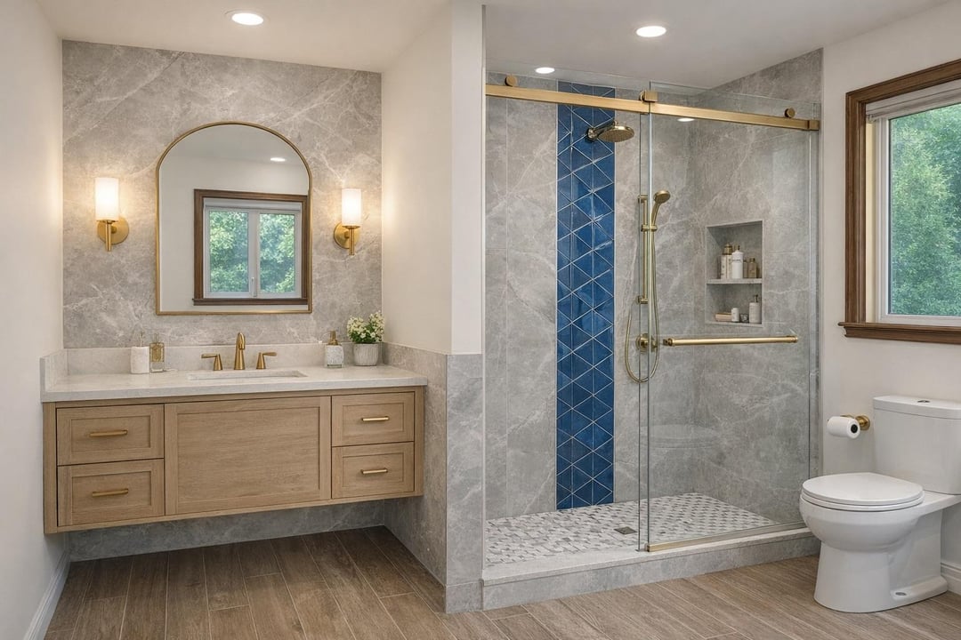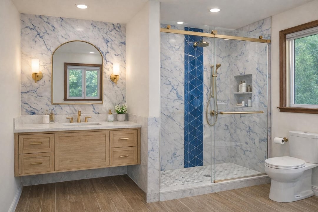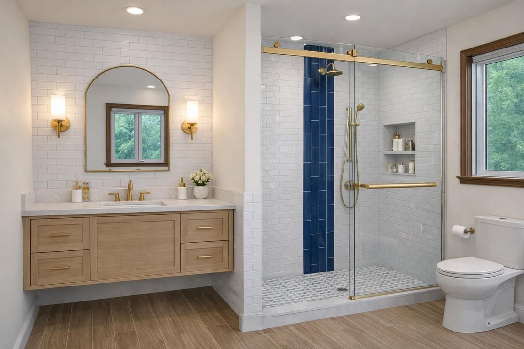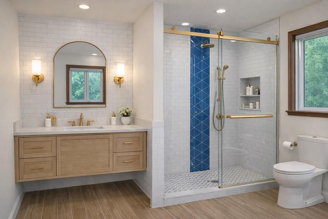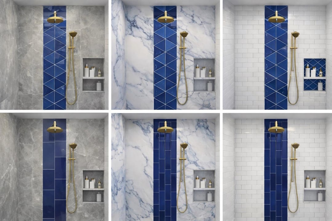 The attached comparison photo is purely to compare the two blue tile options with the three background tile options (imagine bottom left blue tile is the same as bottom middle and right). Other than gold/brass hardware, the niche I’m still figuring out. I have also added a few generated samples for the room – *note: the shower head (with accent) will be on the right wall next to the window*, and the white portion of the median wall will be glass. The floor is a wood-like tile.