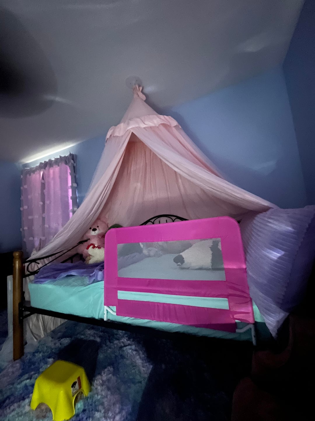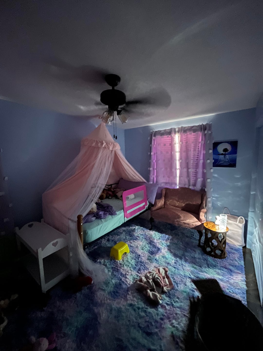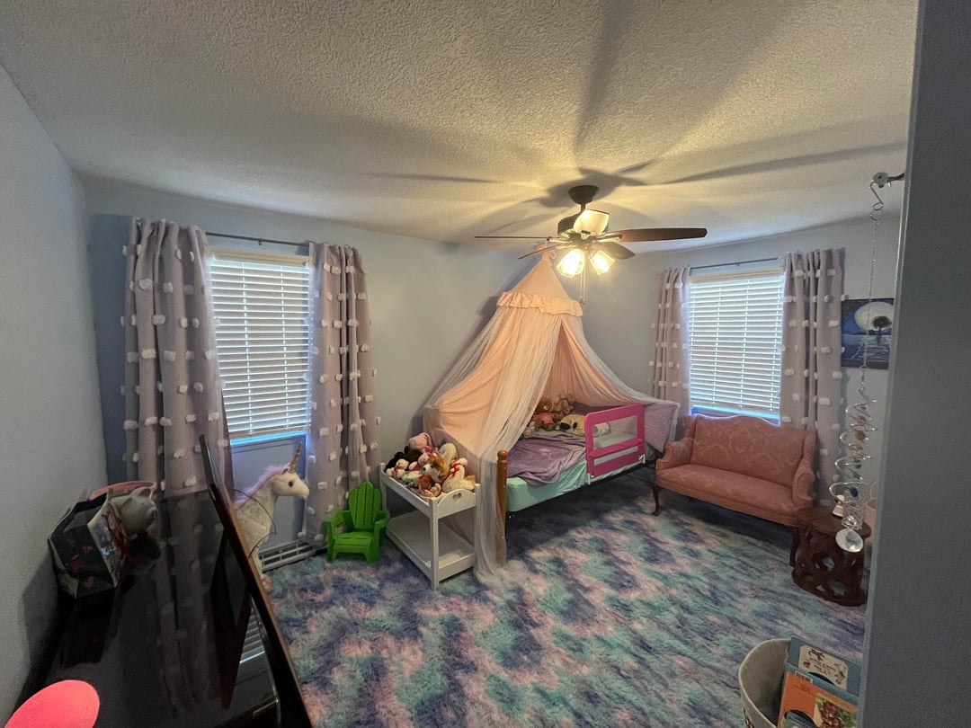 We still need to hang the mirror above her dresser and put hardware on her closet doors, but thoughts? I didn’t want to overly theme it, just make it wispy and whimsical. I also plan to swap the ceiling fan for a fandelier and add crown molding (monochrome, painted the same powder blue) over the summer when we have more time, but we have a baby coming in a few weeks and needed to get this done.