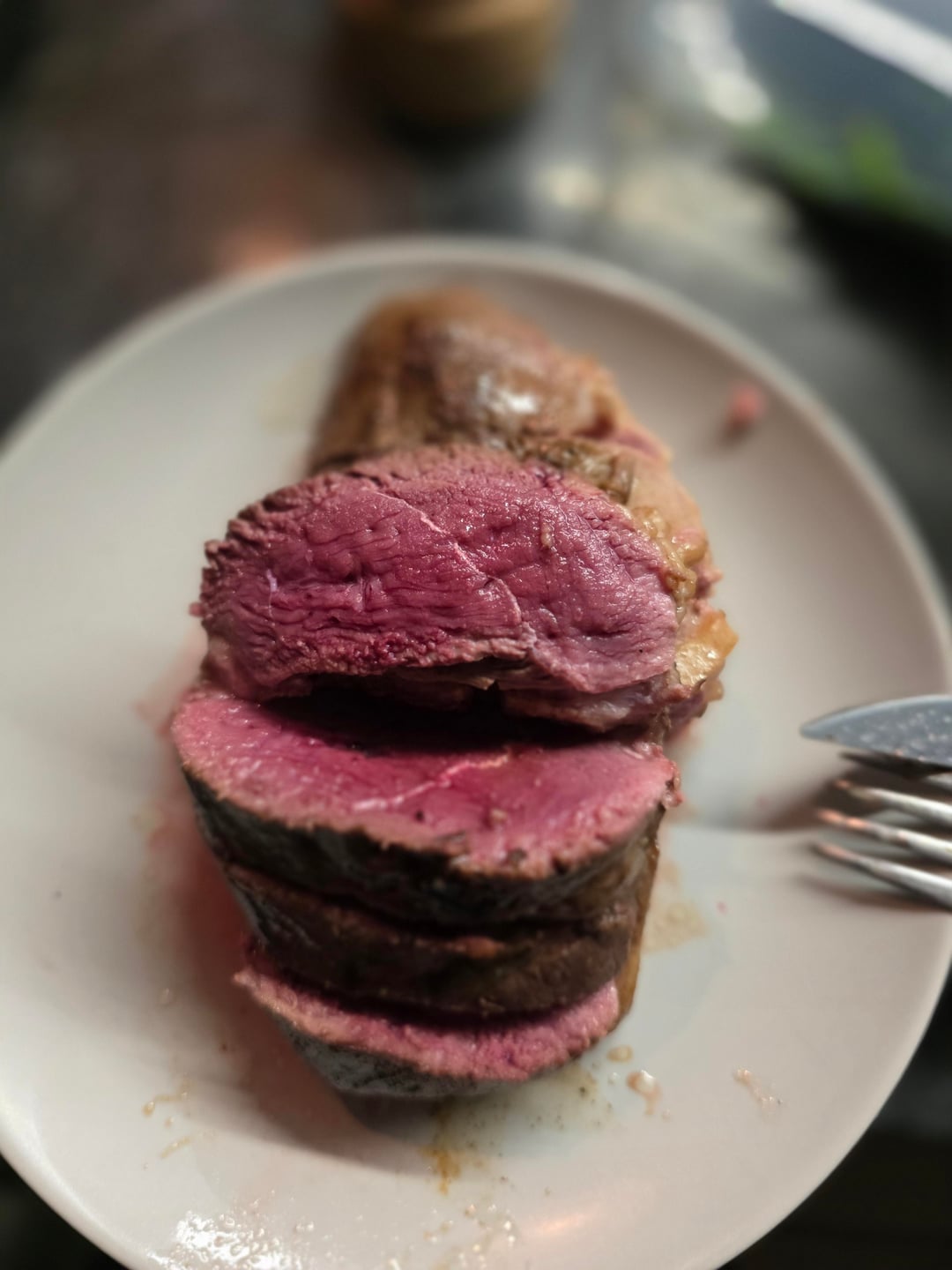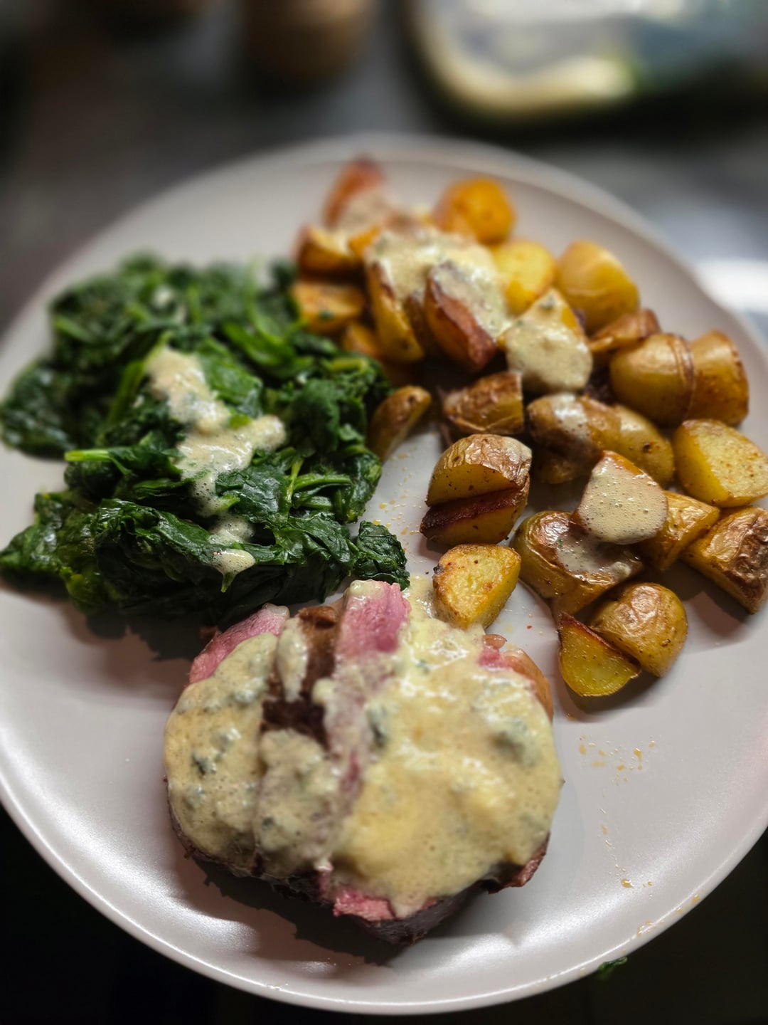 Magret de canard et pommes de terre sautées en sa graisse, épinards au naturel. Tout local sauf la sauce au bleu d'Auvergne. Un délice !