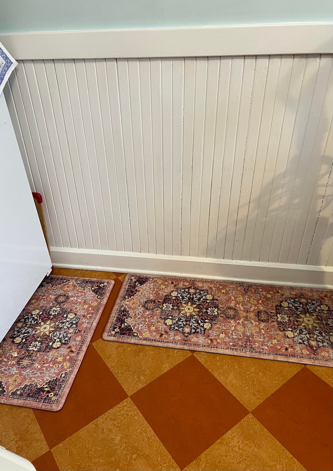I’m will post photos of the colors in my kitchen. I am a renter. The walls are a pale blue the cabinets are dark wood and the floor is like a terra-cotta orangey color. And the appliances are white. I’m for specific recommendations for kitchen rug or runner. Thank you!