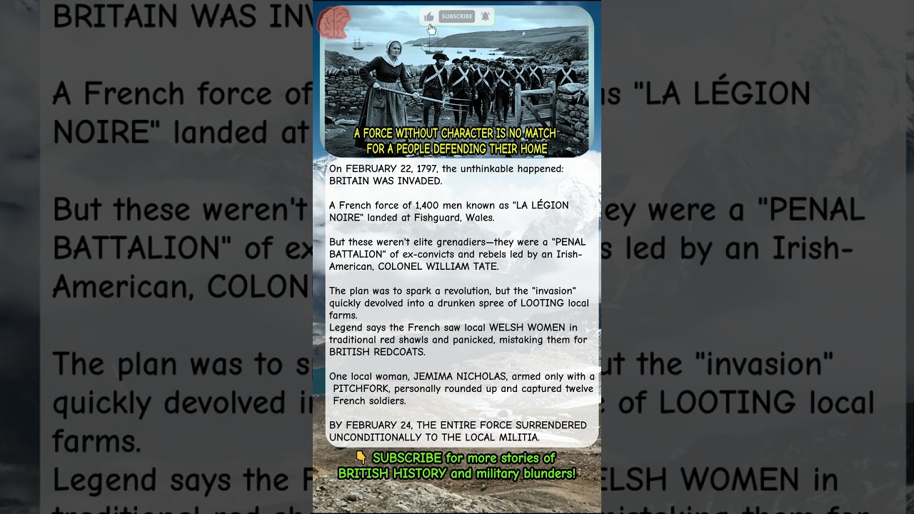 Hashtags: #Shorts #OnThisDay #History #ForYou #HistoricalFacts #DidYouKnow #shortsfeed #HistoryShorts #TodayInHistory #Feb22 #1797 #Fishguard #LastInvasion #BritishHistory #Wales #FrenchRevolutionaryWars #MilitaryHistory #JemimaNicholas #BattleOfFishguard #HistoryBuff