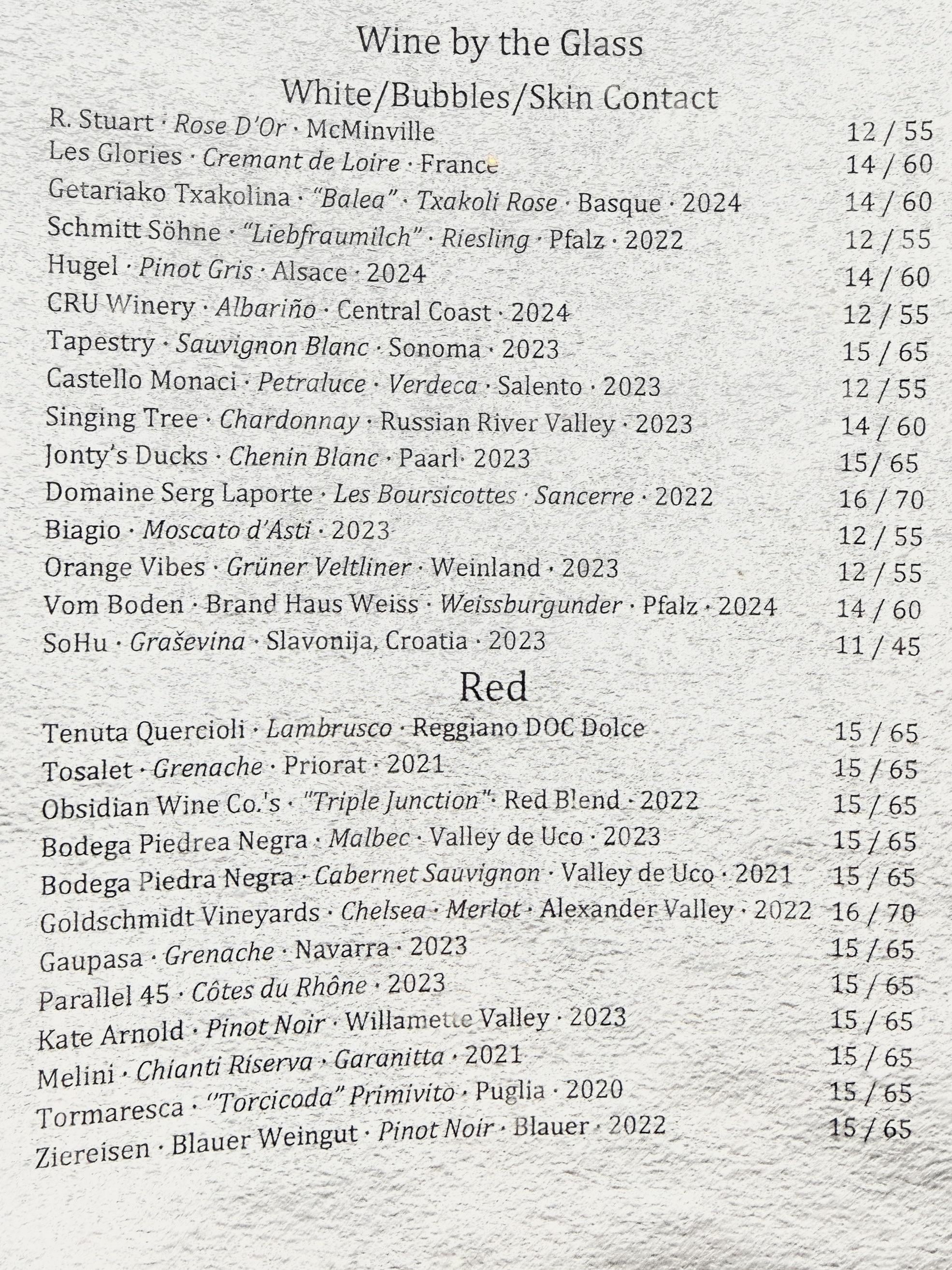 That looks like a really interesting list to me. Lots of stuff you don’t often see. I would try a few btg. Maybe the txacoli, veltliner, Oregon pinot noir, Priorat.