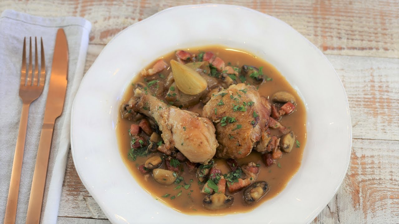 This timeless French casserole recipe is made of seared chicken cooked in a casserole, served with a garnish of bacon, caramelized onions, sautéed mushrooms and a side of potatoes.