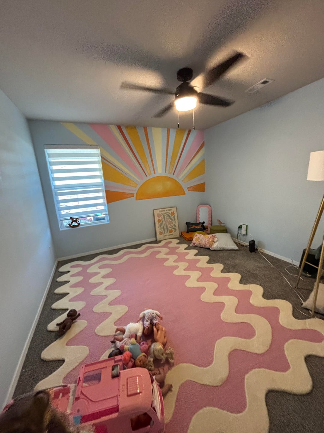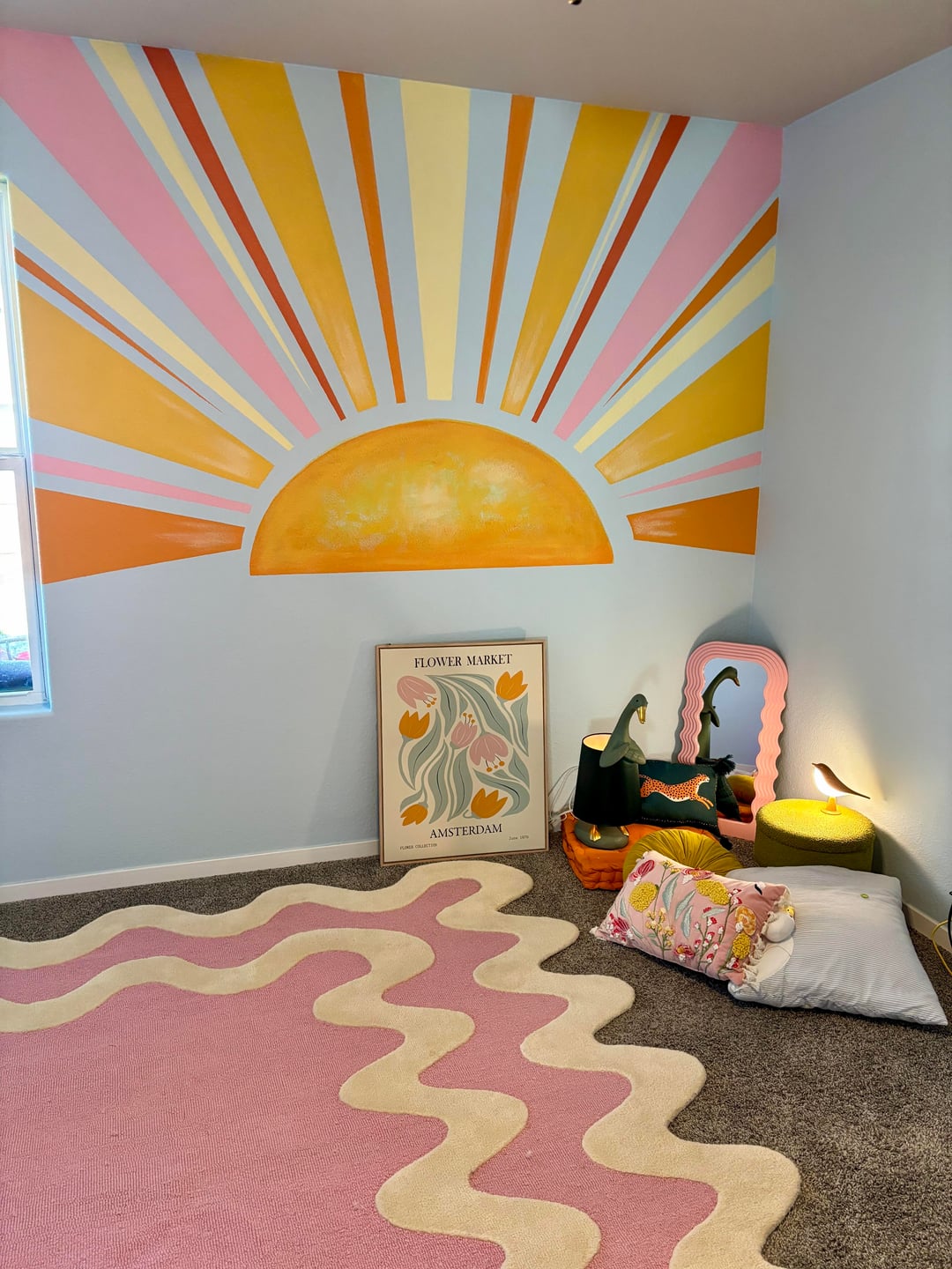 I am so obsessed with that gorgeous rug, and I love that you continued the pink to the sun’s rays! Please post a pic when it’s all done and furnished!