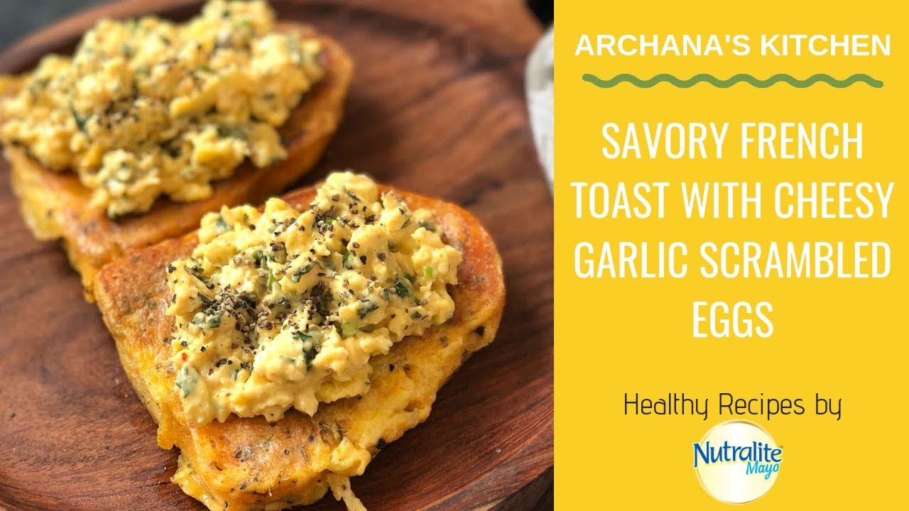 These Cheesy Garlic Scrambled Eggs topped over savory French Toast that are cooked until lightly crisp are perfect for a wholesome high protein weekend breakfast or an after school snack for kids. Serve it along with a glass of fresh fruit juice or a smoothie to complete the breakfast meal.