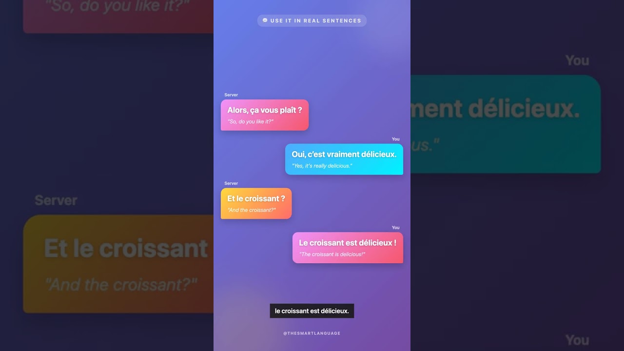 In French, don’t just say “bon” (good). Use “délicieux” — day-lee-syuh — meaning “delicious.” At a restaurant, you can say: “C’est délicieux !” (It’s delicious!) Want to sound extra natural? Add “vraiment”: “C’est vraiment délicieux !” Try it with food: “Le croissant est délicieux.” Quick recap: “délicieux” = delicious. Say it out loud: “C’est délicieux !” Follow for more!