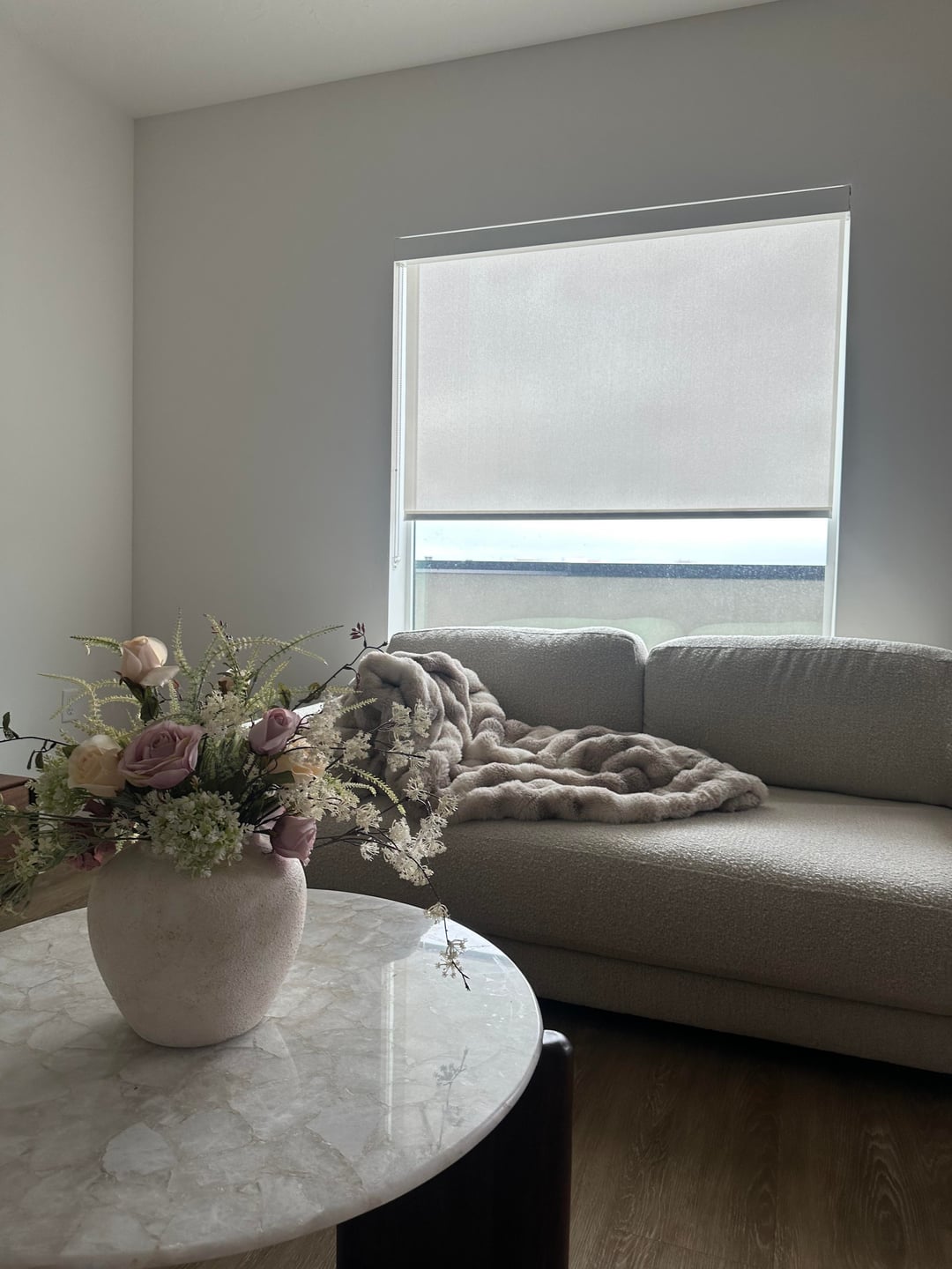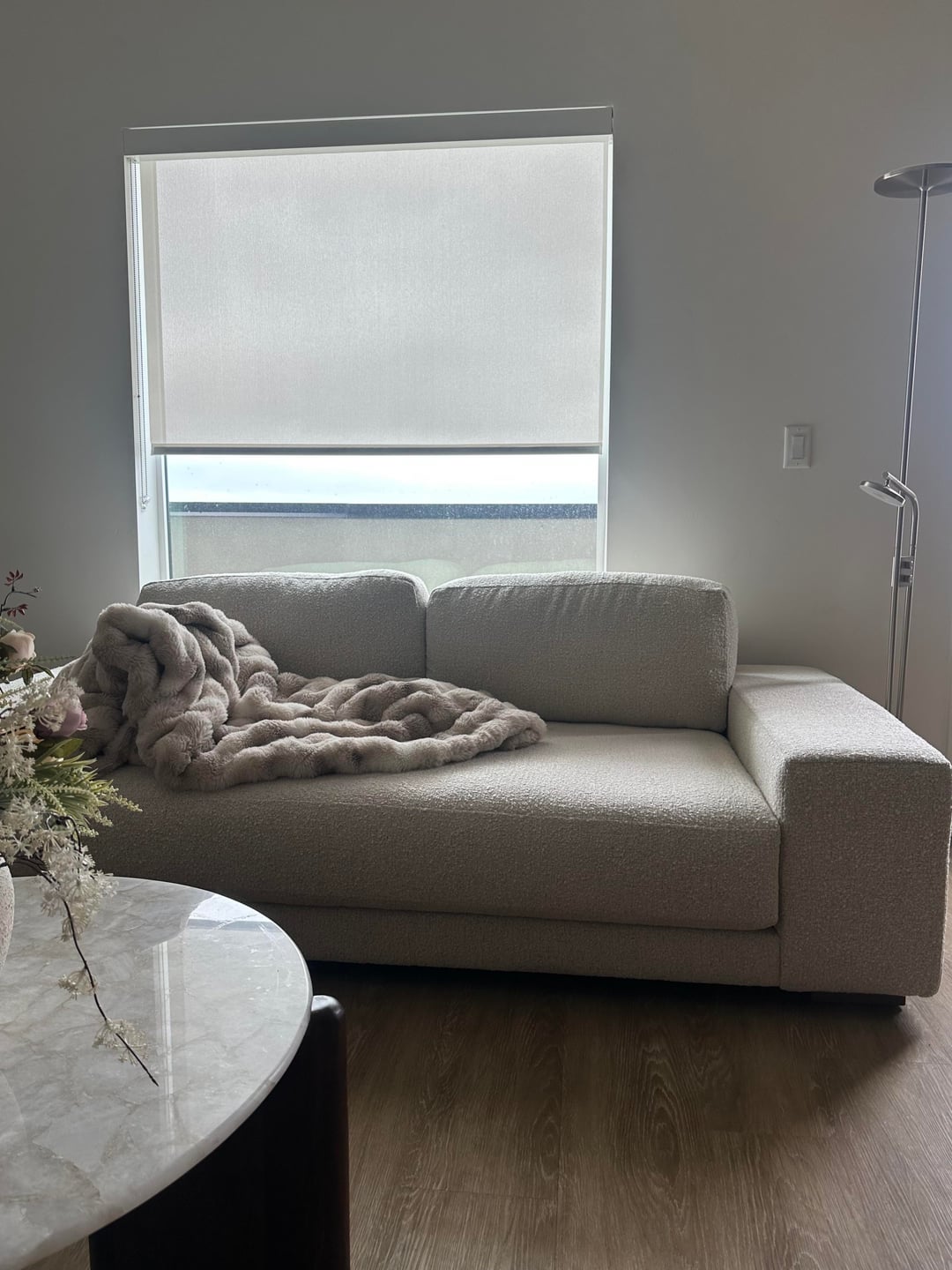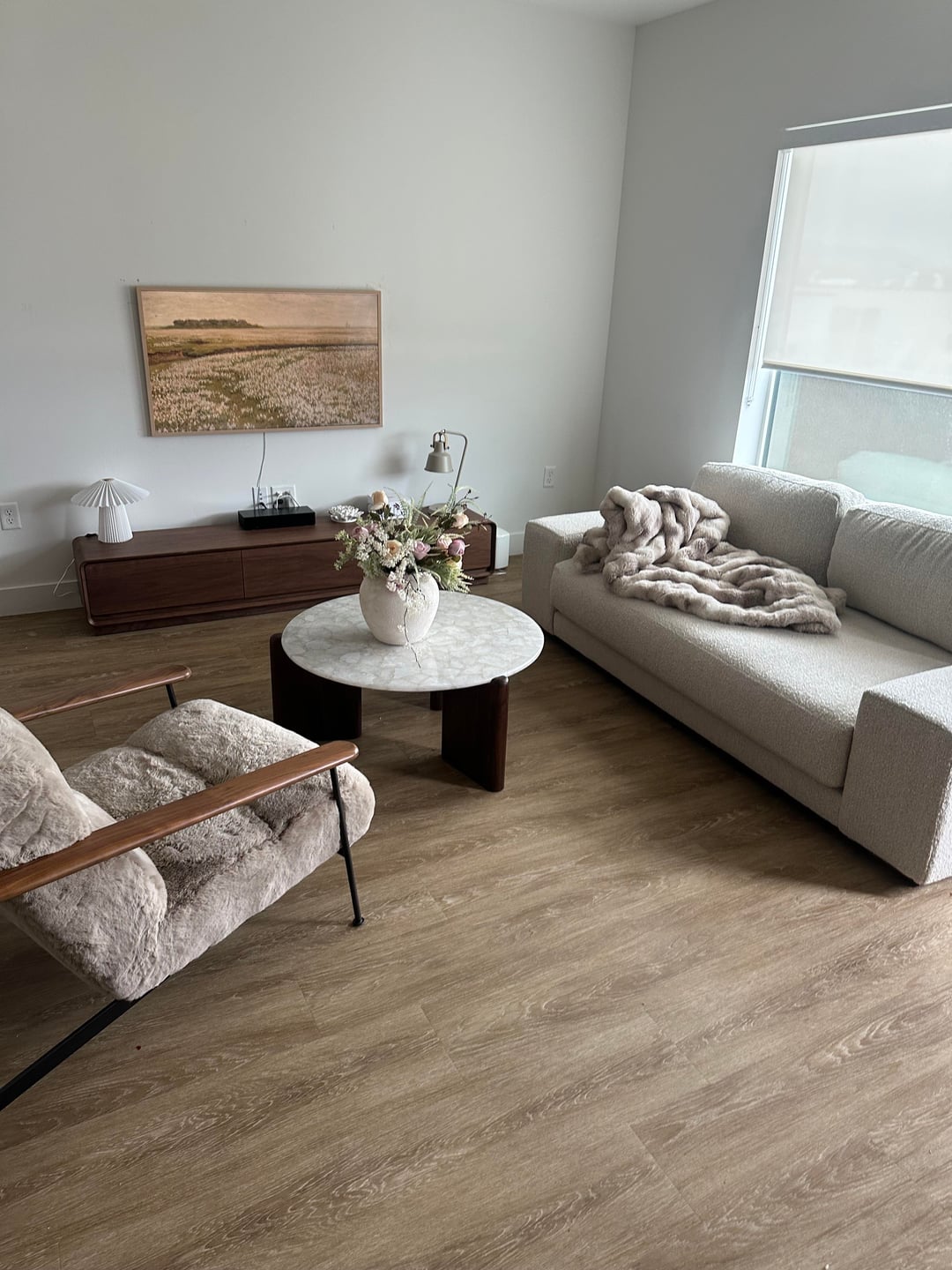 Needs some color. Art, rug, curtains, pillows?