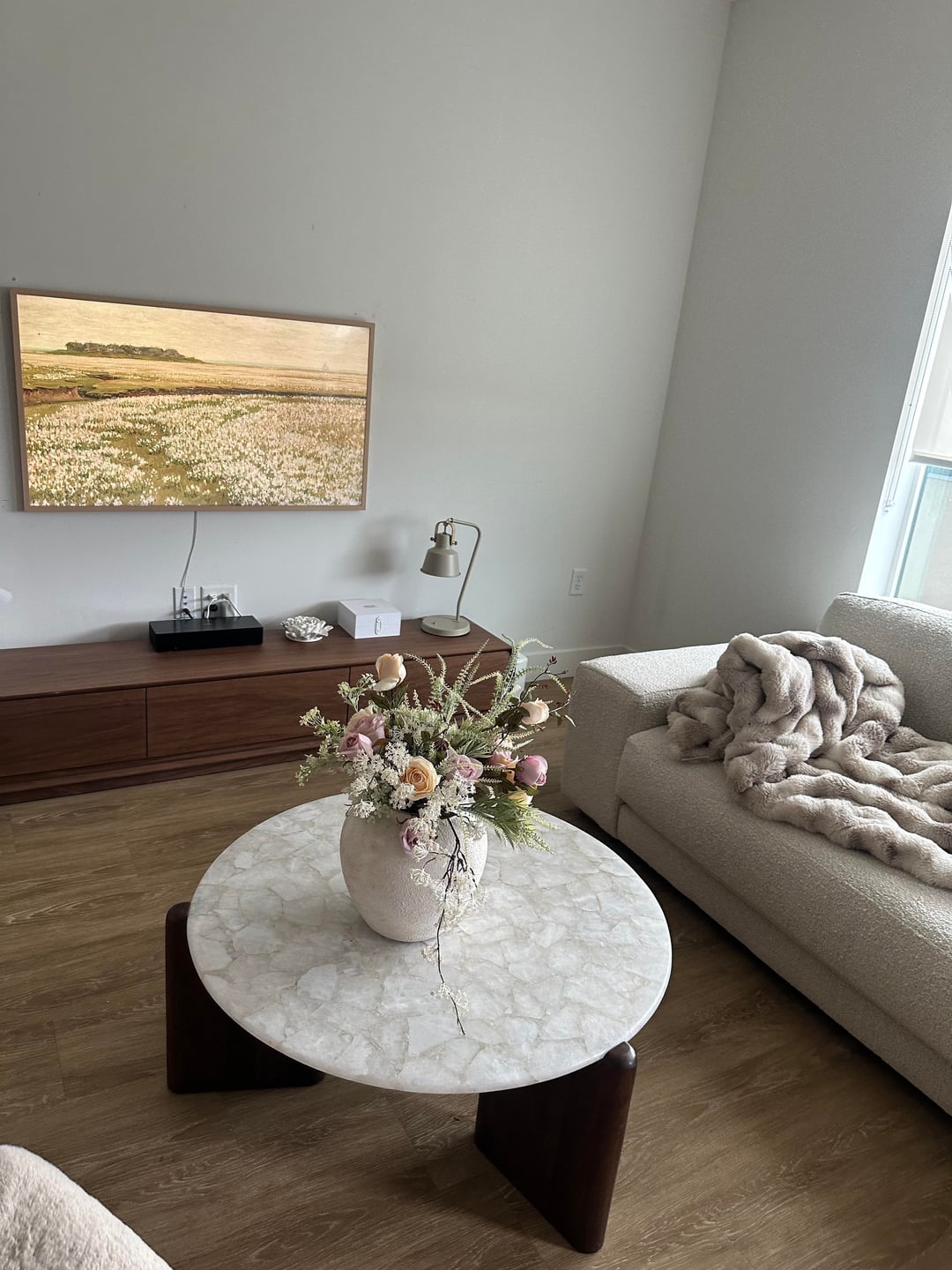 Oh I love the Contempee vase and flowers. I was trying to buy them but they were sold out! I love the room. Maybe a large colourful pic on the wall?