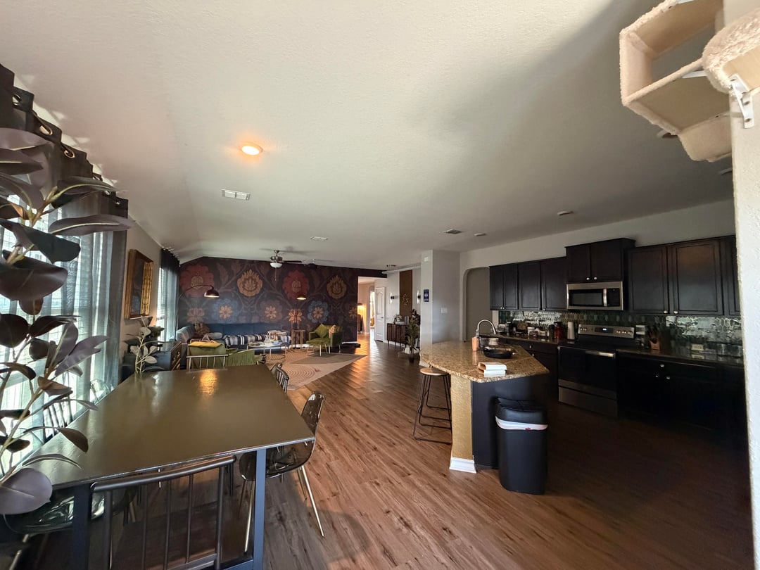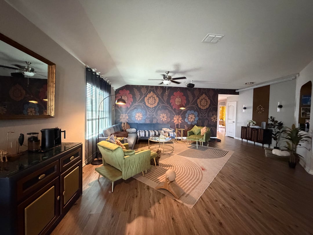 We’ve been here about a year and a half and plan to be here several years longer, so we decided we’d paint enough and go for the wallpaper. Aside from some small touches like pots for our fake plants (don’t @ me, I love plants but our cats eat them) final touches on dining room chairs and stools, and our color-matched couch cover, I’m seriously happy with how our home has cozied up without feeling cluttered!