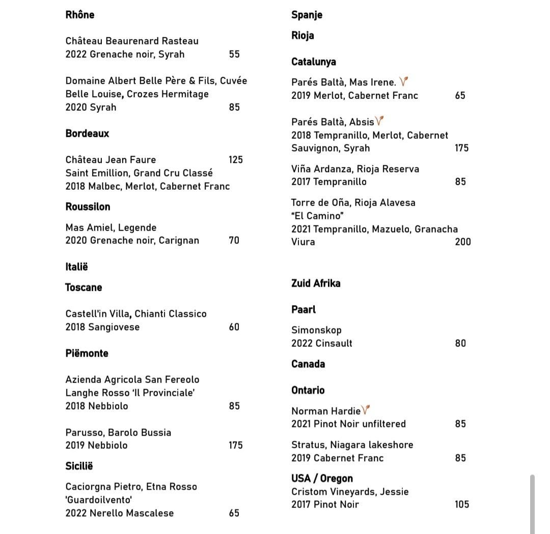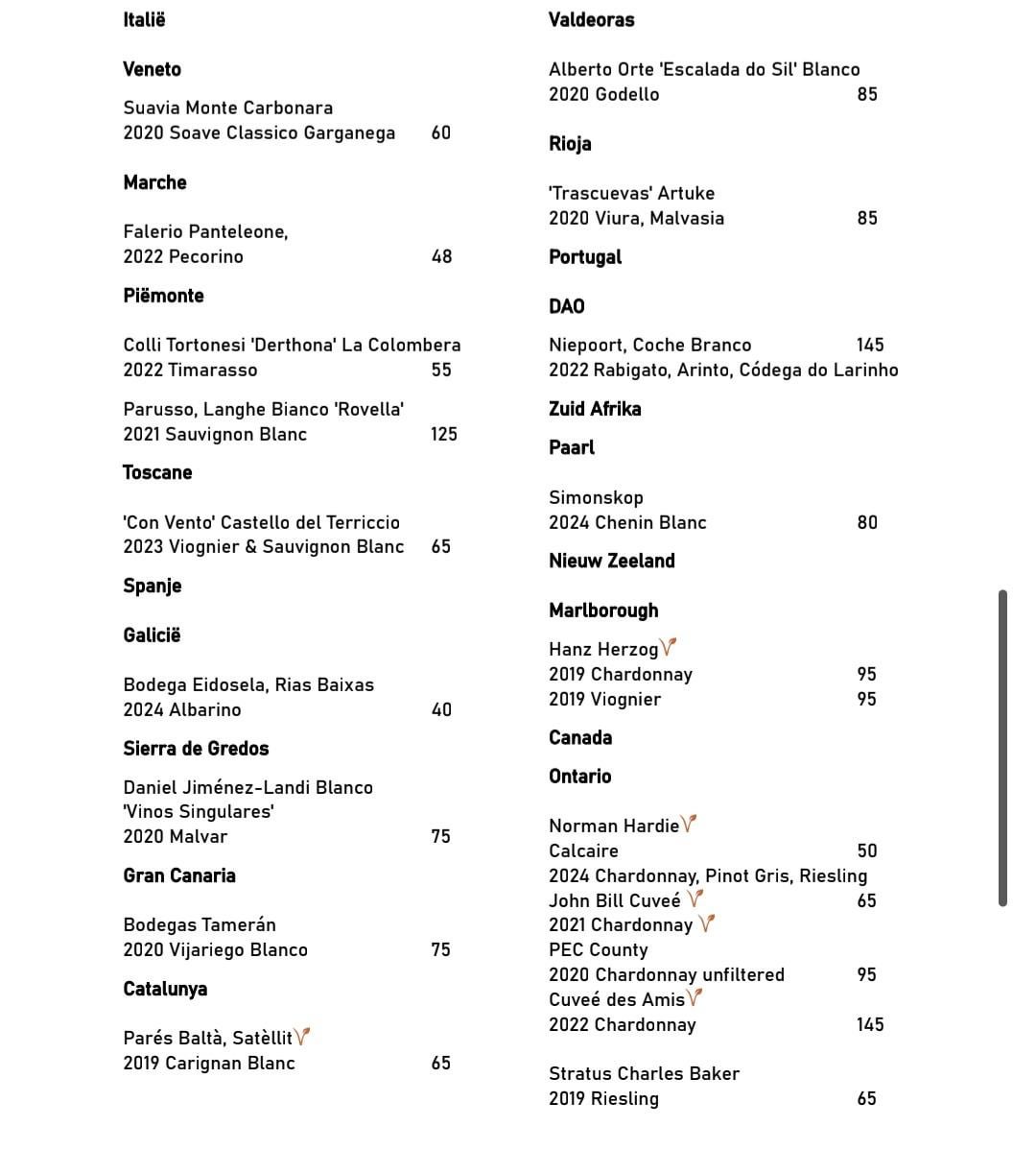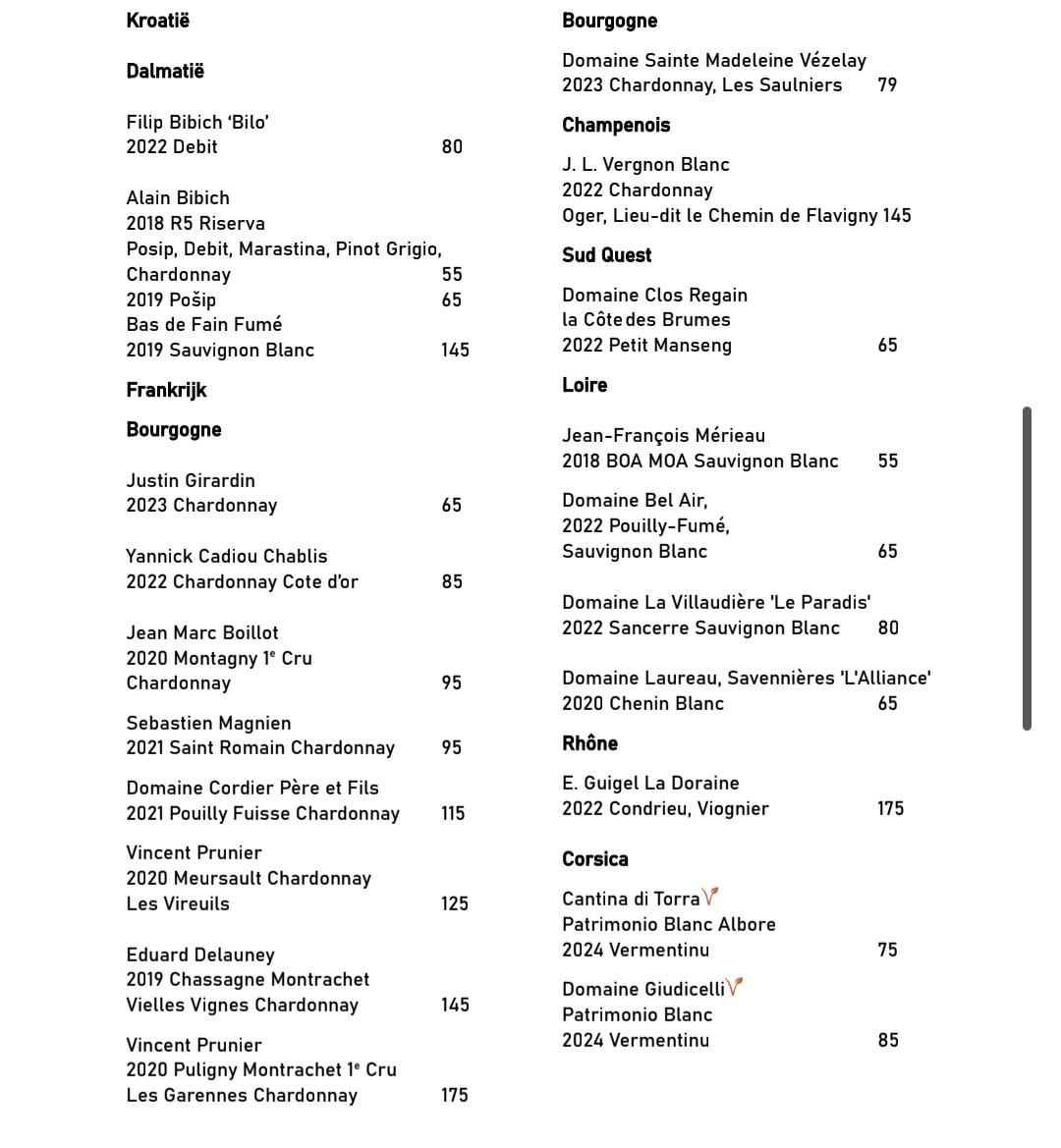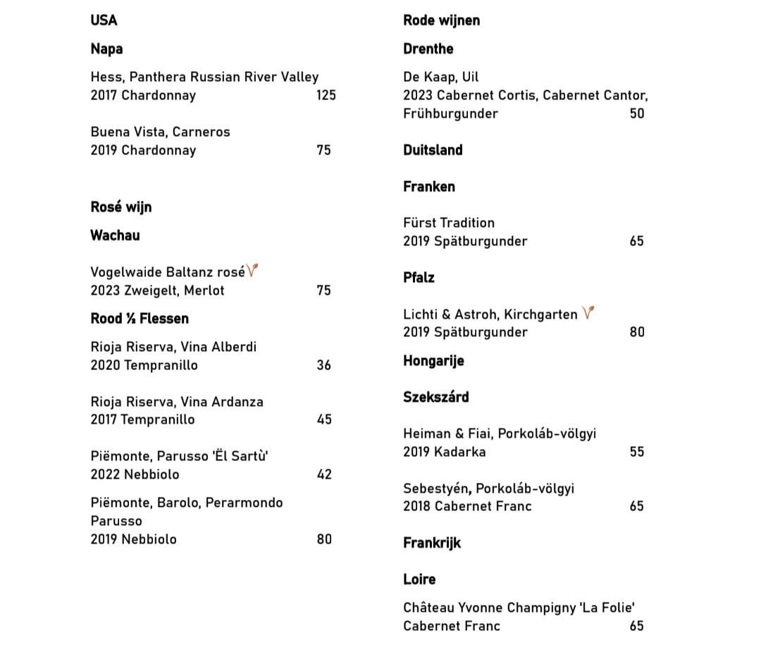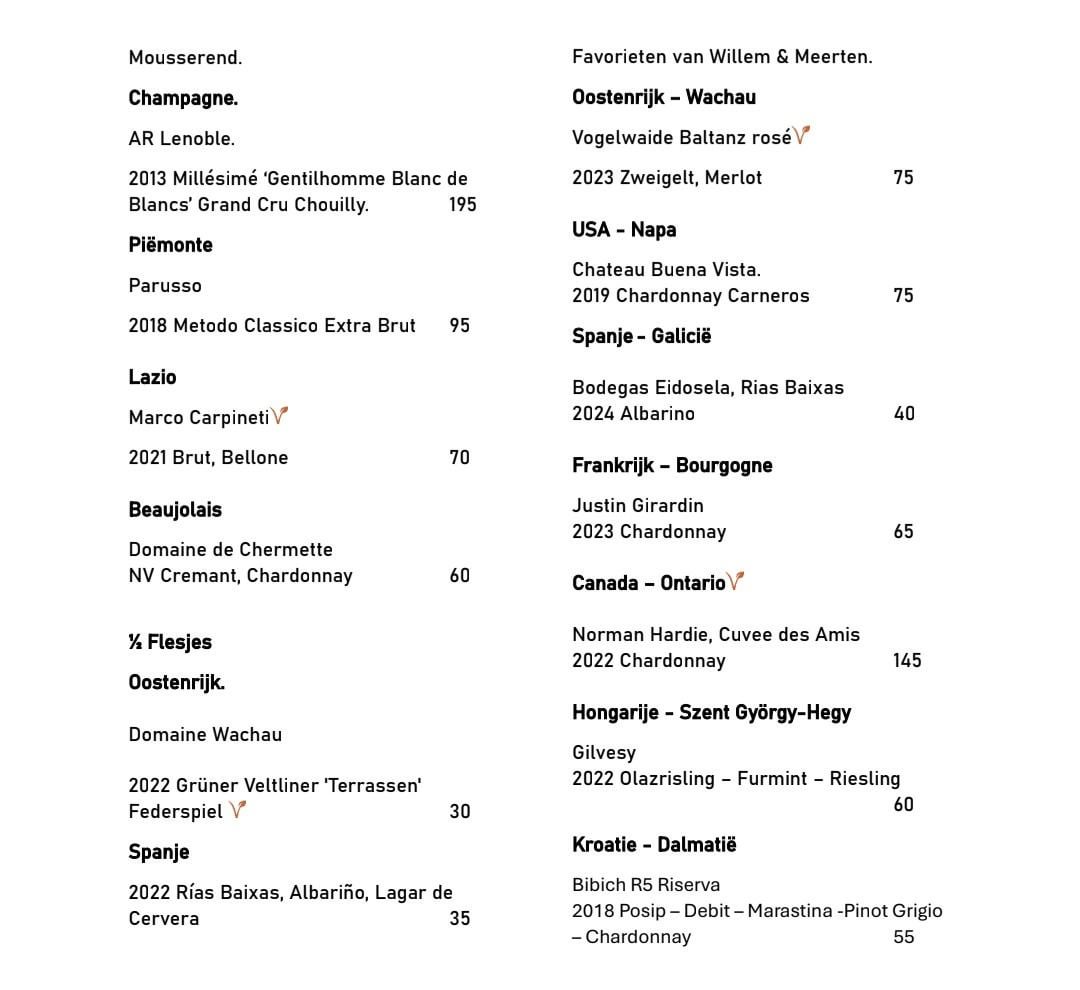 We are going with a large group. We will be ordering around 10 bottles (or more). We will be having meat/fish/vegetarian courses. The wine list is in Dutch. I hope that's not a problem. The whites are on page 2-4 and the reds are on page 5 and 6.