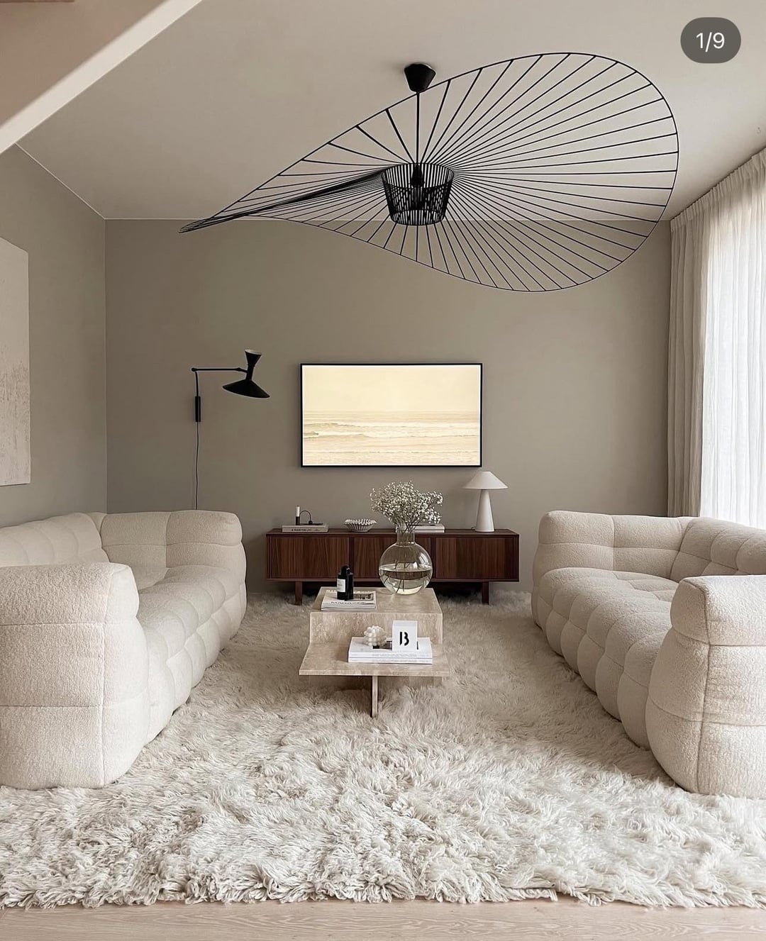 I’ve used that light fixture before in one of my designs, I think it’s cool. I appreciate the shaggy area rug, it brings an airy/whimsical feeling to the room while adding texture. I like the variation of white with a small touch of black.