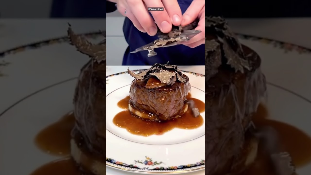 Tournedos Rossini is a French steak dish consisting of beef tournedos (filet mignon), pan-fried in butter, served on a crouton, and topped with a slice of fresh foie gras, briefly pan-fried at the last minute. The dish is garnished with slices of black truffle and finished with sauce madère, a Madeira-based sauce.