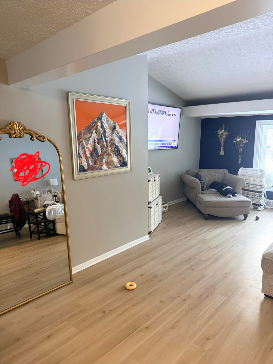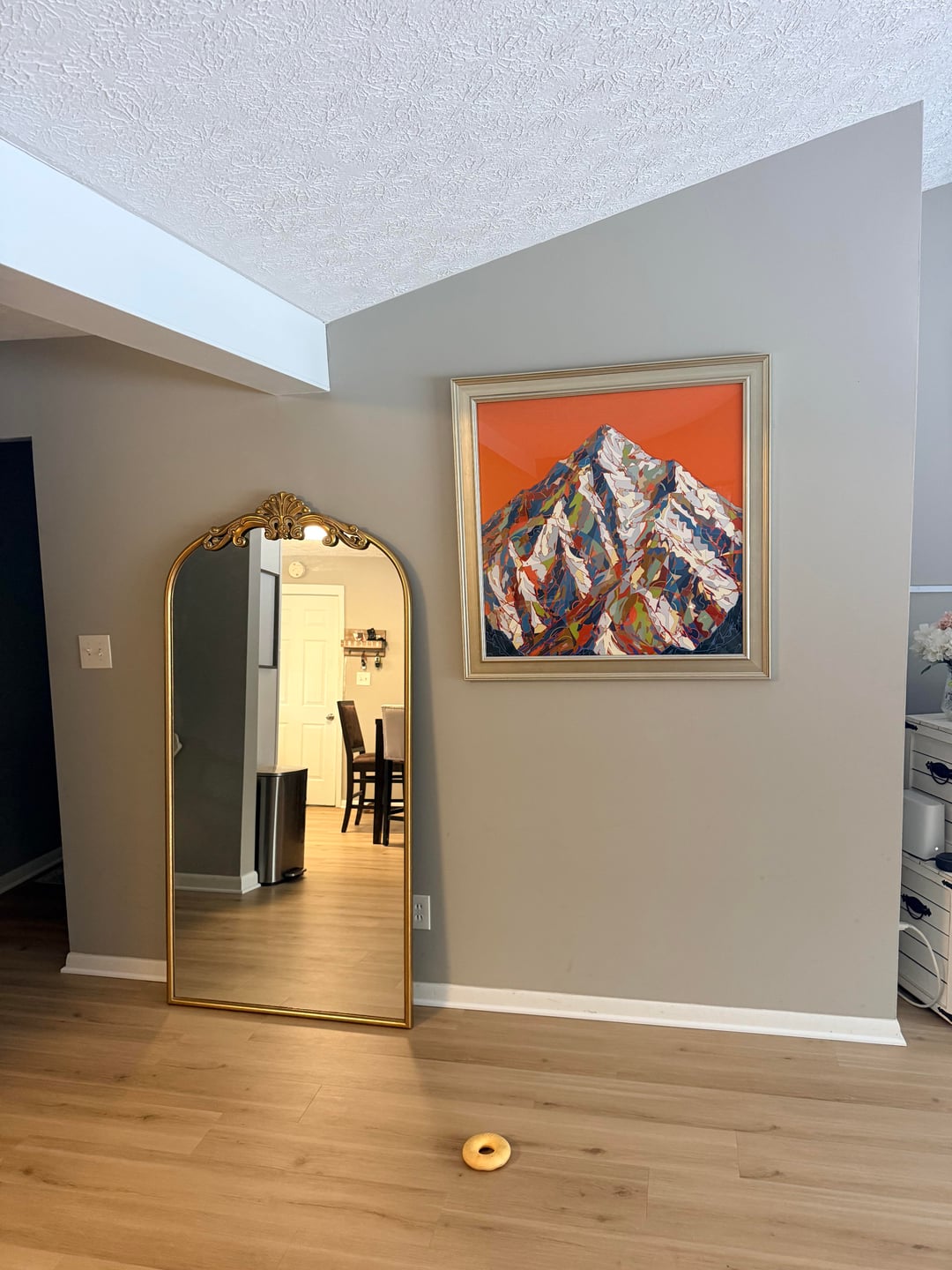 We are hiring somebody to come in and wallpaper this entryway and the wall next to it with the mirror and mountain painting on it. The back wall is a dark, navy blue, and where the mountain painting is, we are going to do a gallery wall of four or six large wedding photos. We want something not too busy, something that goes with our light wood floors, can have color that match matches that navy blue. Any suggestions? The lady who is doing it for us said she wasn’t a fan of peel and stick if it has patterns. I know nothing about quality wallpaper. Any help is very much appreciated!