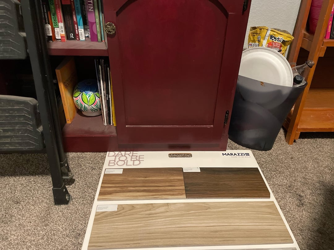 1. The darker wood will show every bit of dust on your floor. I’d go with the medium tone (upper left), though I’d want to see a bigger sample to make sure it’s not too “rustic”.