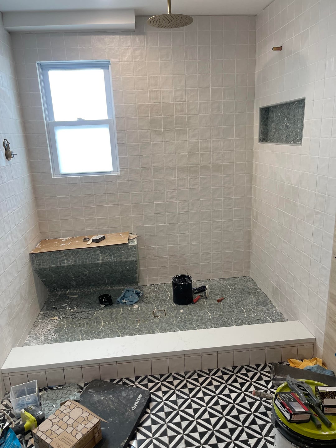 The other commenters are on the money but please take a chisel to the tiles that meet the floor on that shower divide. Either split them neatly in two if the floor is level, or strip out the top thin run and replace it with an accent color. Ideally replace them with a single slab to match the top but…