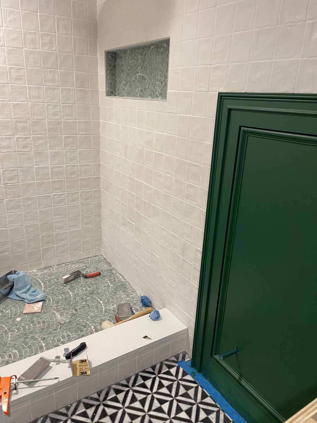 Love the floor and the over design. I really don’t like the shower floor tile. It’s not that it not nice, it’s not symmetrical in my mind. It needs to be turned around, I am sure that it’s just me. The green and shower wall tile are 🫶🏻
