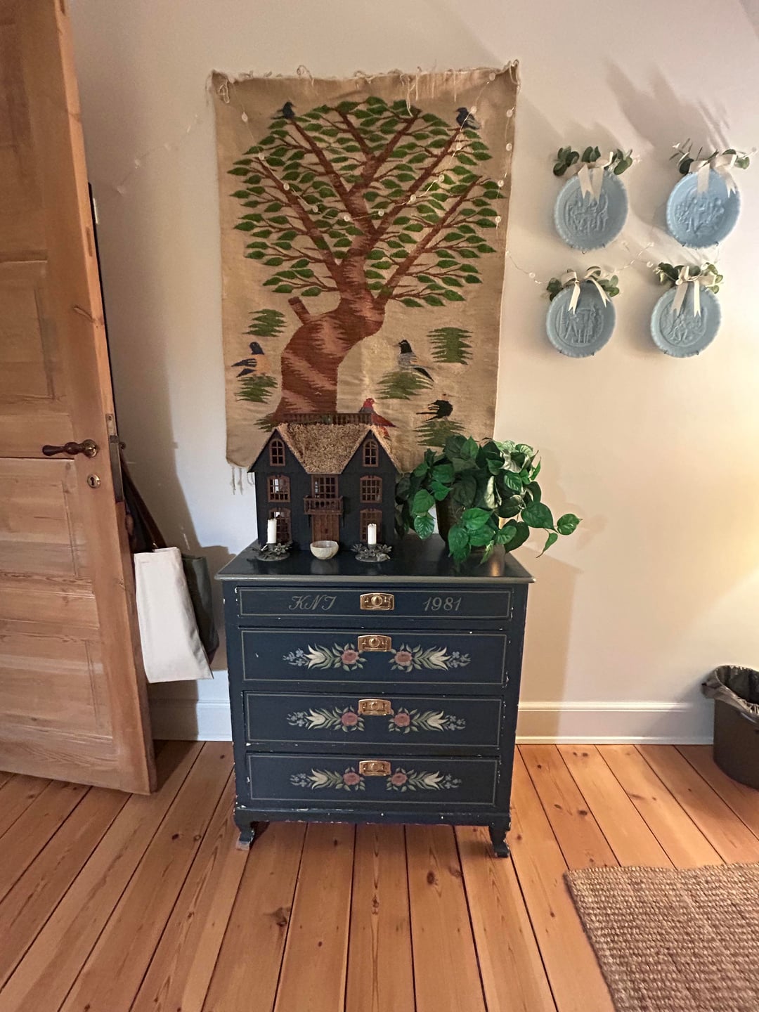 I posted earlier asking for help with my office. I got lots of great ideas which I tried but I was just not finding the right thing. Someone said “The right thing will come” and so I decided to wait. Low and behold, the lost amazing hand painted dresser popped up on FB Marketplace today and I snatched it up. I could not be happier!