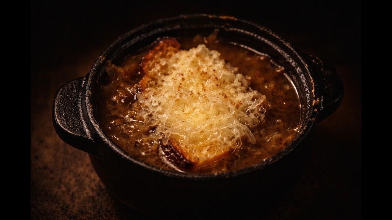 Slowly caramelized onions melt into a deep, rich broth, finished with toasted bread and bubbling Gruyère under live embers.
