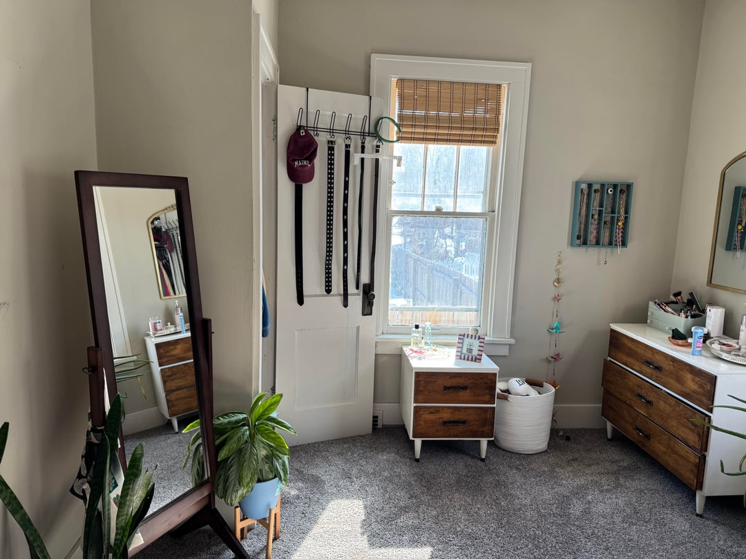This is my office/wardrobe room. I intend to move the furniture so I can put a papasan chair/reading nook in the corner (this will be very functional and get a lot of use for me!!). Think lamps and plants and a nice big rug to tie everything together.
