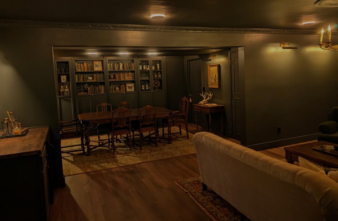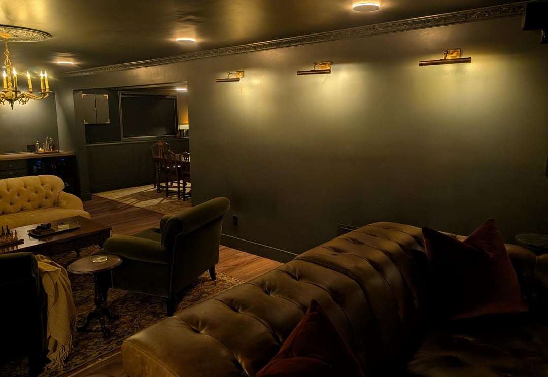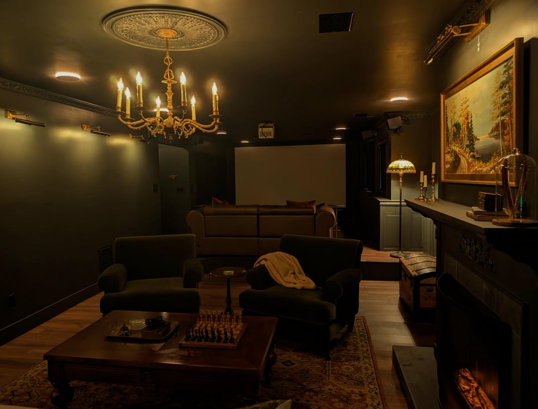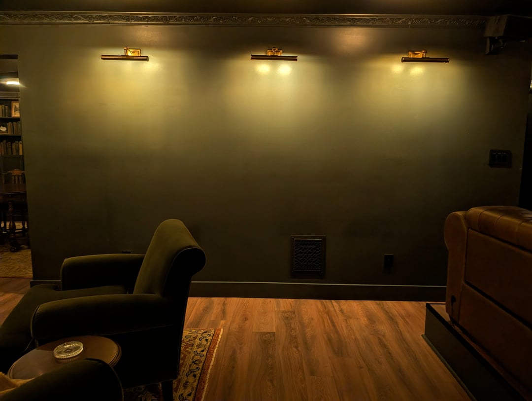 This is a basement area with low ceilings (8 ft/244 cm). The walls look slightly green but are actually dark grey/almost black. Thanks again!