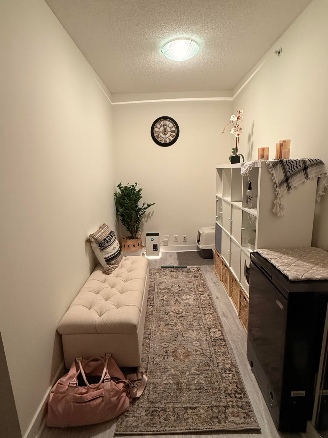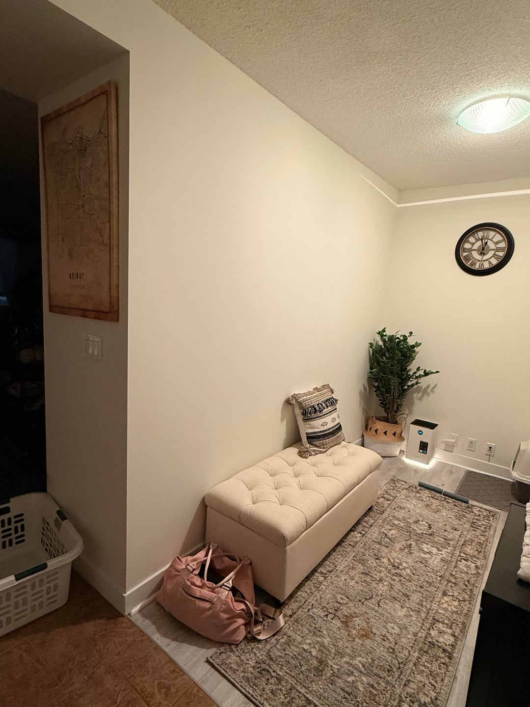 Okay I’ve just started decorating this area after living in this apartment for over a year because I just couldn’t figure out what to put here aside from my cats litter box lol. It’s right when you walk though the door on the right hand side. What kind of art would you put above the ottoman? Should it be a large white canvas the same length or bigger than the ottoman with light colours? Can you attach ideas of stuff on Etsy?