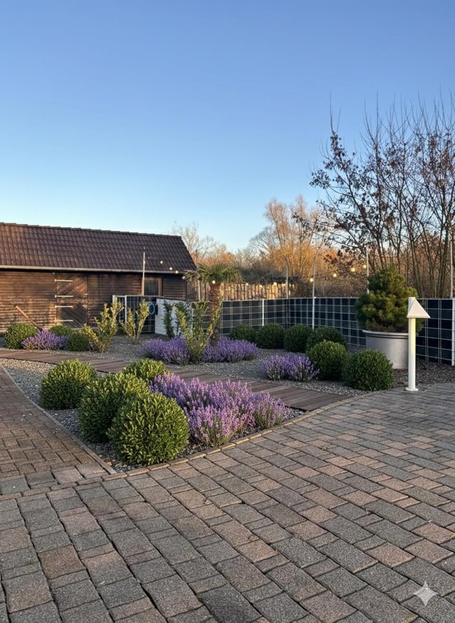 Me gusta la idea de los arbustos de madera y las lavandas … probablemente sea bastante árido, pero también podría hacer un espacio para algunas plantaciones de hierbas y verduras comestibles cerca del edificio en el fondo. (usando traducir tan disculpas si la traducción del inglés no es del todo correcta)