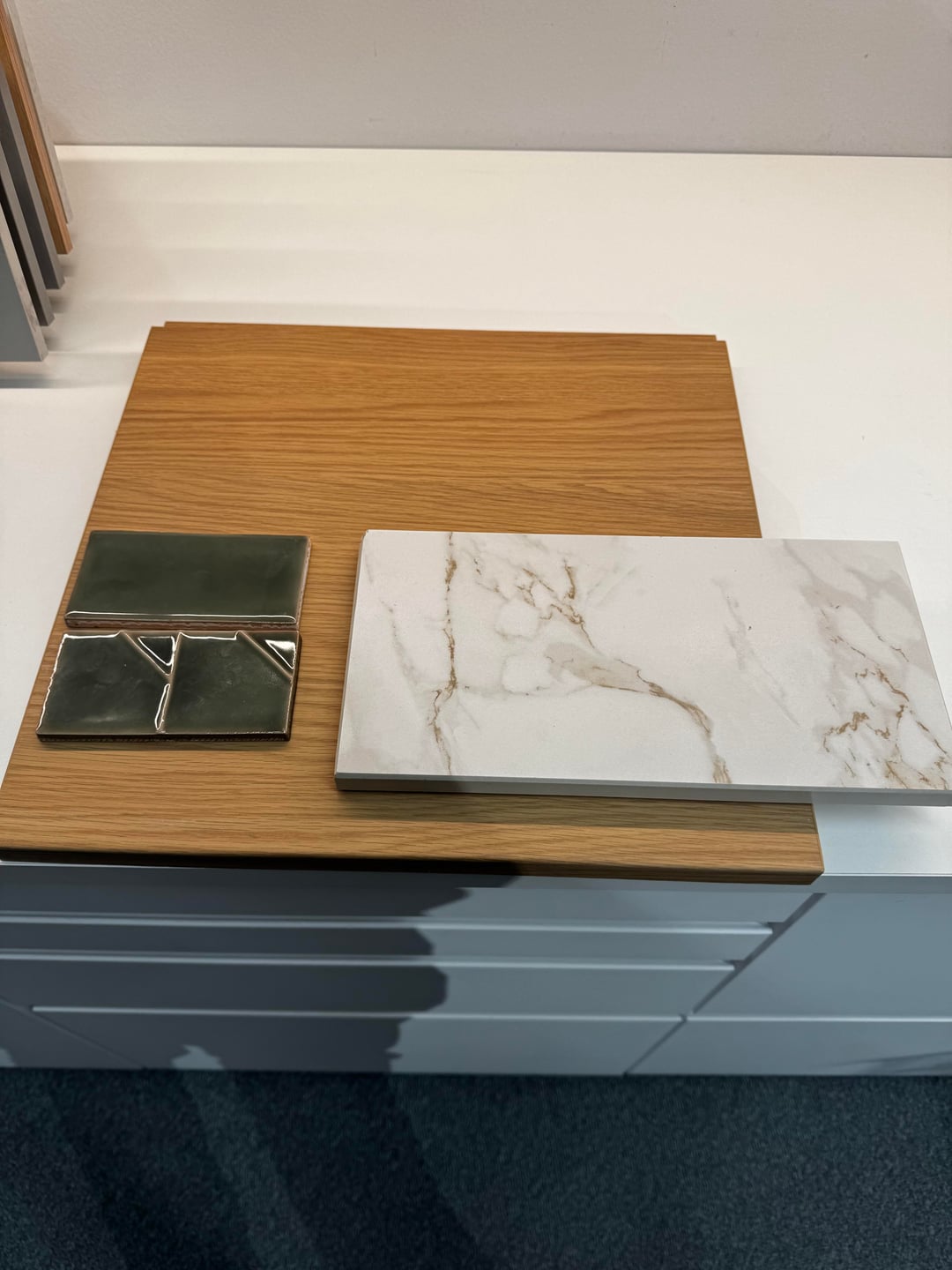 I have chosen my backsplash tile, and I'm doing a blend of these plain tiles and the decor tiles to make a semi-random effect.