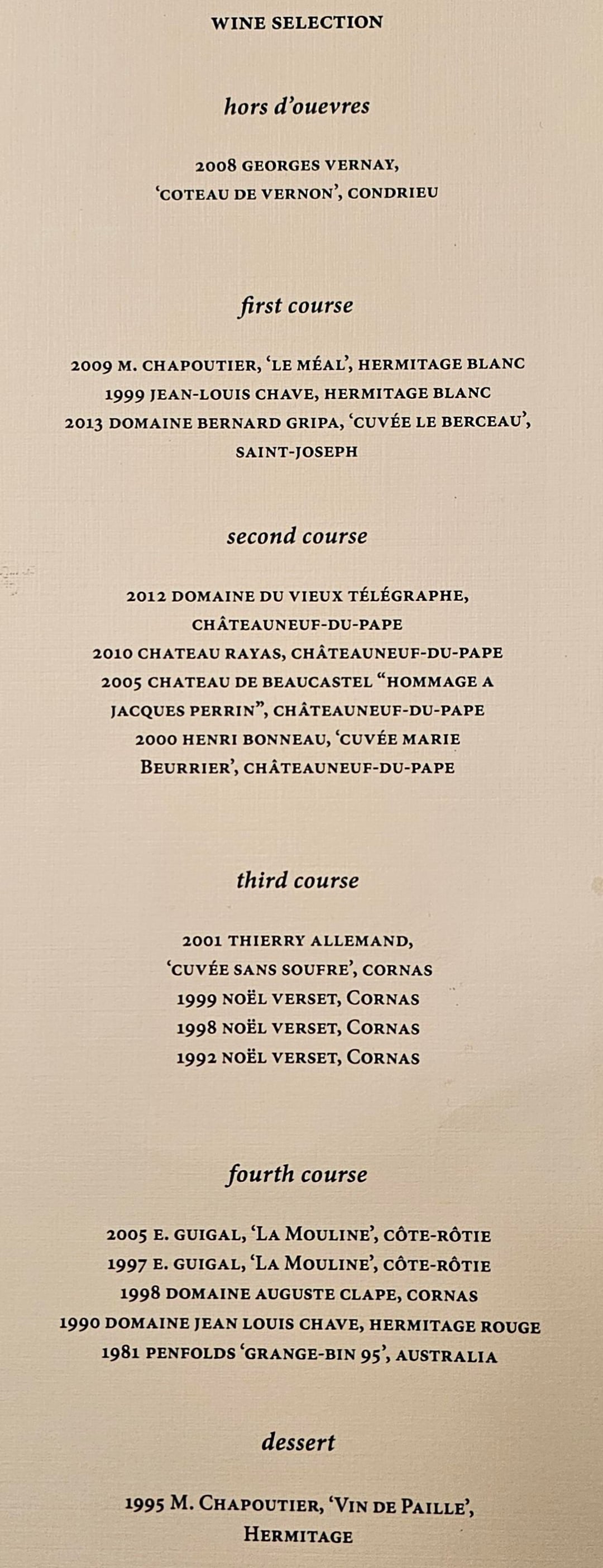 Worked another insane wine dinner tonight. Lineup focused primarily on Rhone Valley with a last minute substitute of 81' Penfolds 'Grange-Bin 95'. Can't say I'll ever see this many epic wines together. Not listed on the menu are Paul Bara Brut Rose and Éliane Delalot Champagne Meuniers d'Exception Impressions. They left a solid amount of wine for me and my team to taste.