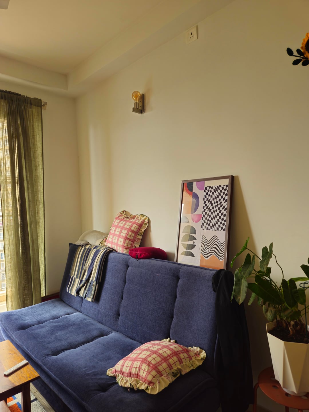 Confused if I should I build a gallery wall around my Samsung Frame TV to lean into the "art" look, or put it above the blue sofa opposite of the TV to balance out the room?