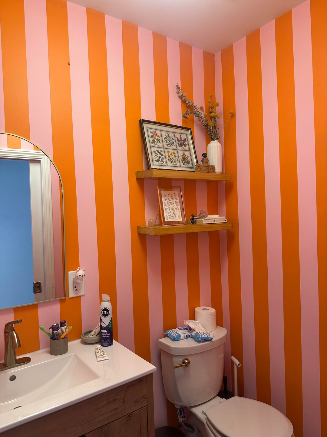 It’s giving Juno in the best way possible 😆 I would leave the stripes behind the toilet and sink as an accent wall and repaint the rest
