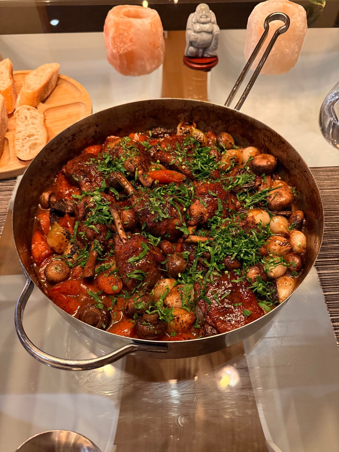 It needed some air to coax out the bouquet, but once it opened, it had bright notes of red cherries, cranberry, brambly underbrush, sage, wet clay, and some floral character. Medium body, with fine. Smooth tannins. The only thing that sticks out a bit is the acidity, which is a touch high, causing the mouthfeel to feel a bit disjointed. That being said, it paired really well with the coq au vin so no complaints.