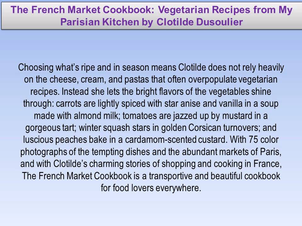 Choosing what’s ripe and in season means Clotilde does not rely heavily on the cheese, cream, and pastas that often overpopulate vegetarian recipes. Instead she lets the bright flavors of the vegetables shine through: carrots are lightly spiced with star anise and vanilla in a soup made with almond milk; tomatoes are jazzed up by mustard in a gorgeous tart; winter squash stars in golden Corsican turnovers; and luscious peaches bake in a cardamom-scented custard. With 75 color photographs of the tempting dishes and the abundant markets of Paris, and with Clotilde’s charming stories of shopping and cooking in France, The French Market Cookbook is a transportive and beautiful cookbook for food lovers everywhere.