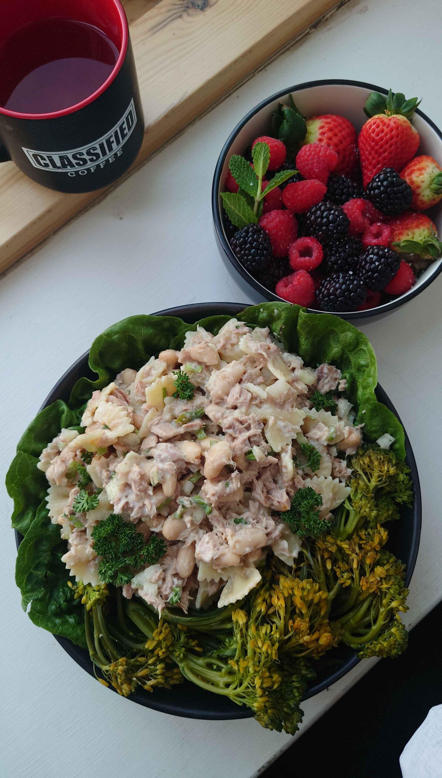 Salade de pâtes au thon avec haricots cannellini avec Tasse d’eau du robinet et Dessert bol de Mûres/Fraises/Framboise feuilles de menthe en accompagnement.