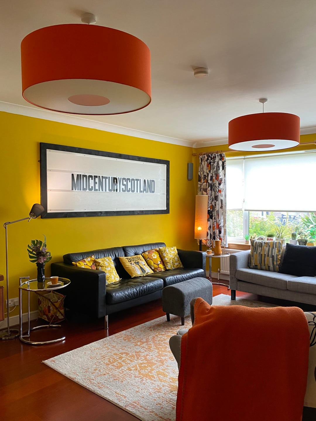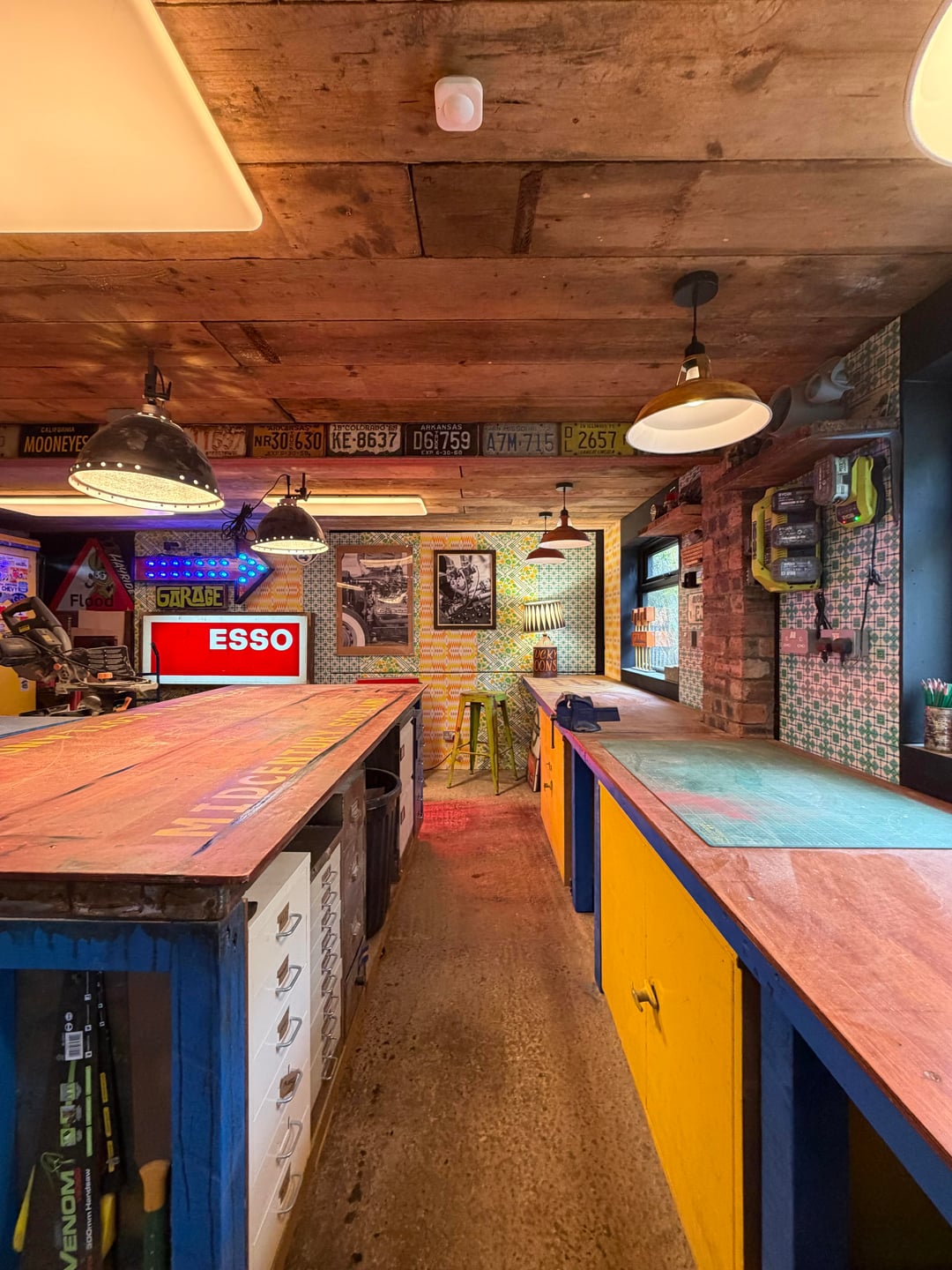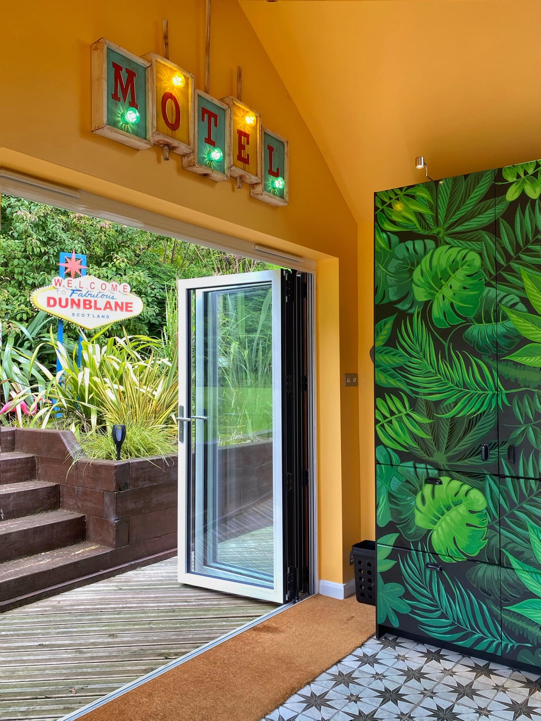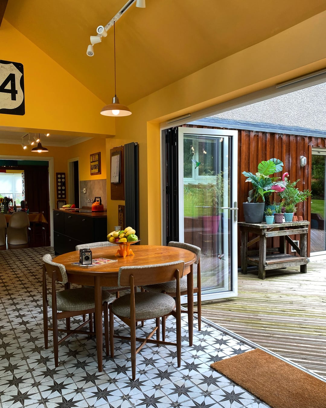 Here is our colourful home in Scotland. I've done most of the work myself, including building an extension/addition for the kitchen and building the shed, smoke shack and Tiki bar. I recently finished revamping my workshop where I like to build my googie inspired signs. We love colour and took inspiration from 50s/60s car colour charts.