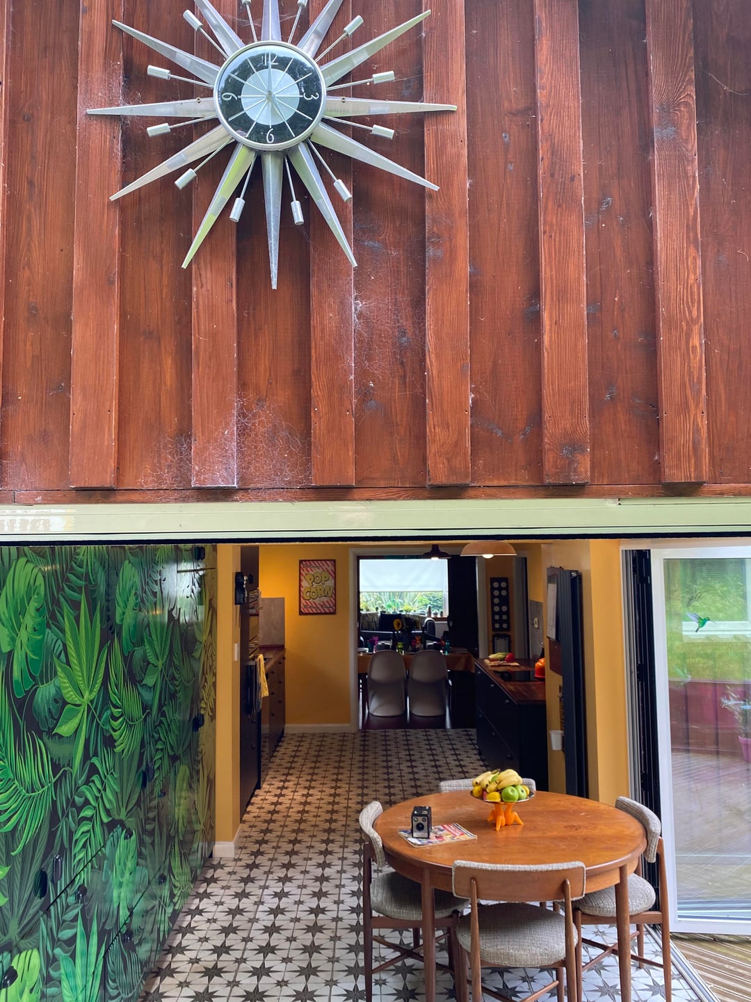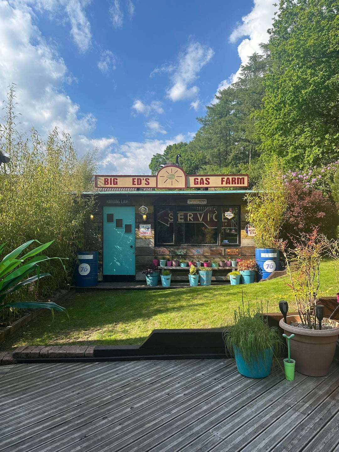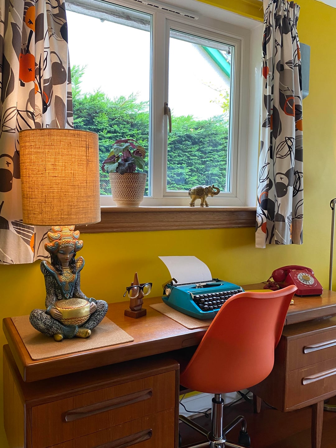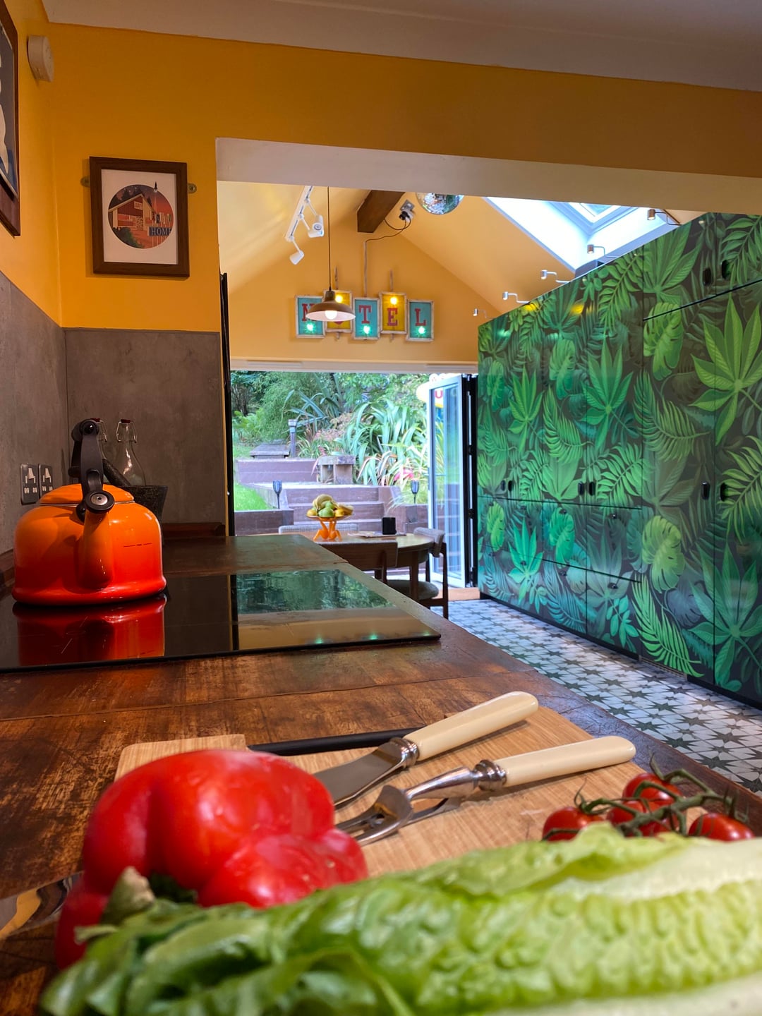 Here is our colourful home in Scotland. I've done most of the work myself, including building an extension/addition for the kitchen and building the shed, smoke shack and Tiki bar. I recently finished revamping my workshop where I like to build my googie inspired signs. We love colour and took inspiration from 50s/60s car colour charts.
