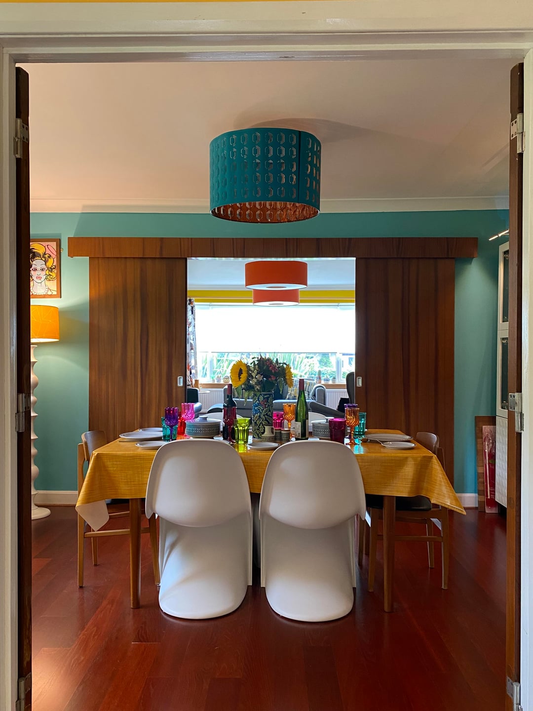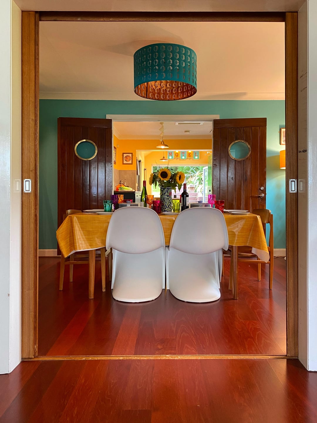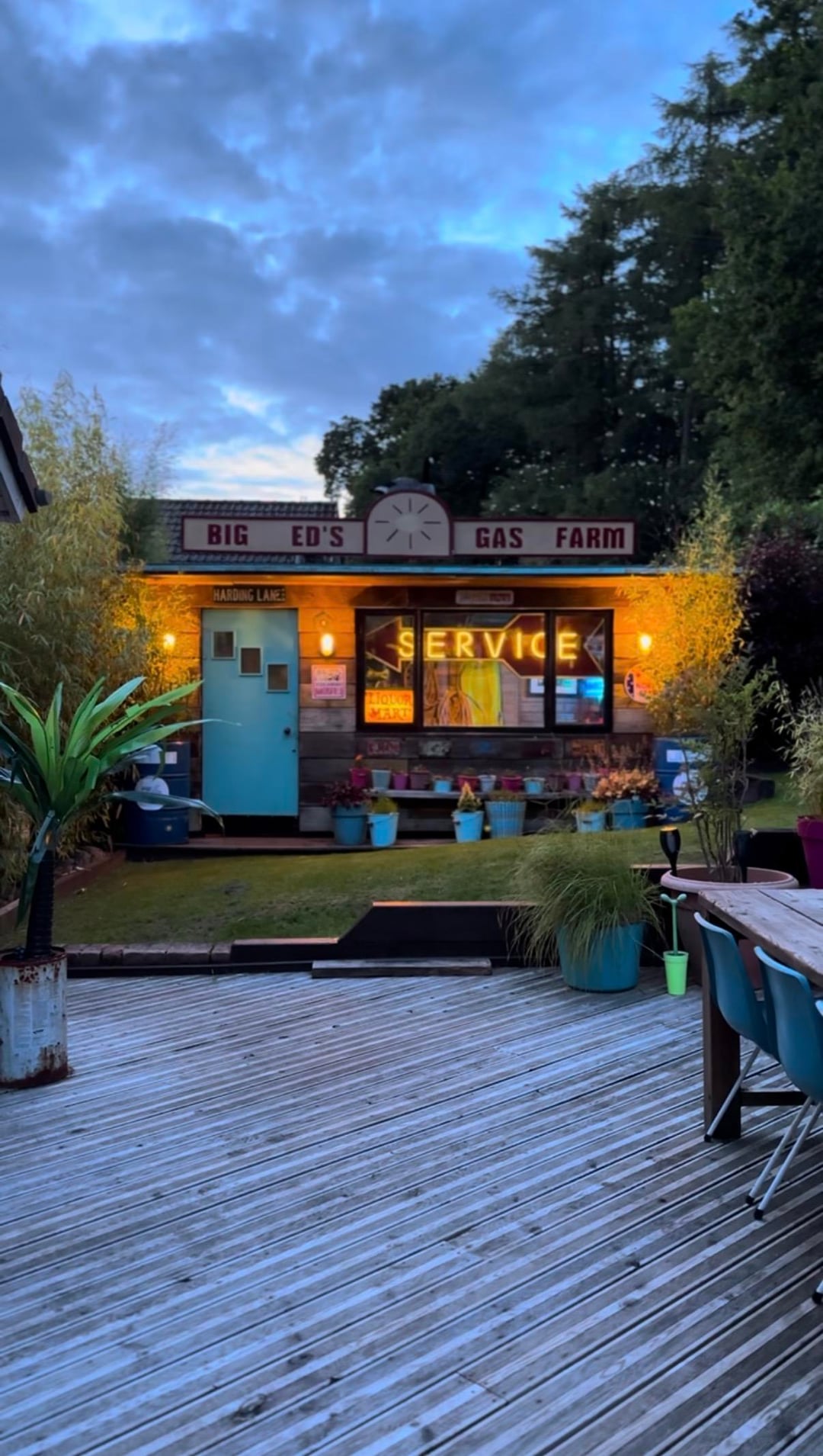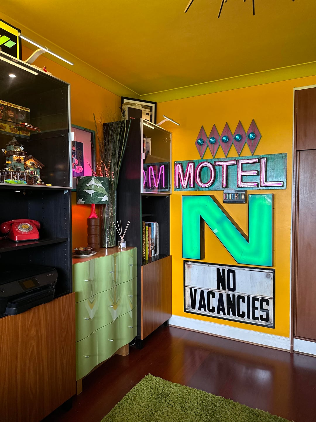 Here is our colourful home in Scotland. I've done most of the work myself, including building an extension/addition for the kitchen and building the shed, smoke shack and Tiki bar. I recently finished revamping my workshop where I like to build my googie inspired signs. We love colour and took inspiration from 50s/60s car colour charts.
