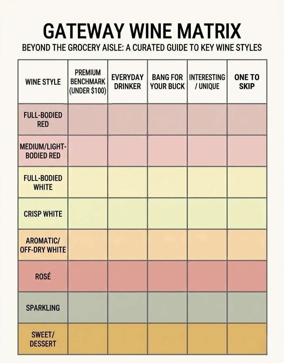 Before I post the next section tomorrow, any feedback on this so far? This rubric is meant for someone who drinks mass produced grocery store wines and wants to expand their wine knowledge, but feels intimidated and does not want to spend a lot of money. I’m splitting medium and light bodied reds into separate rows. What else would you change?