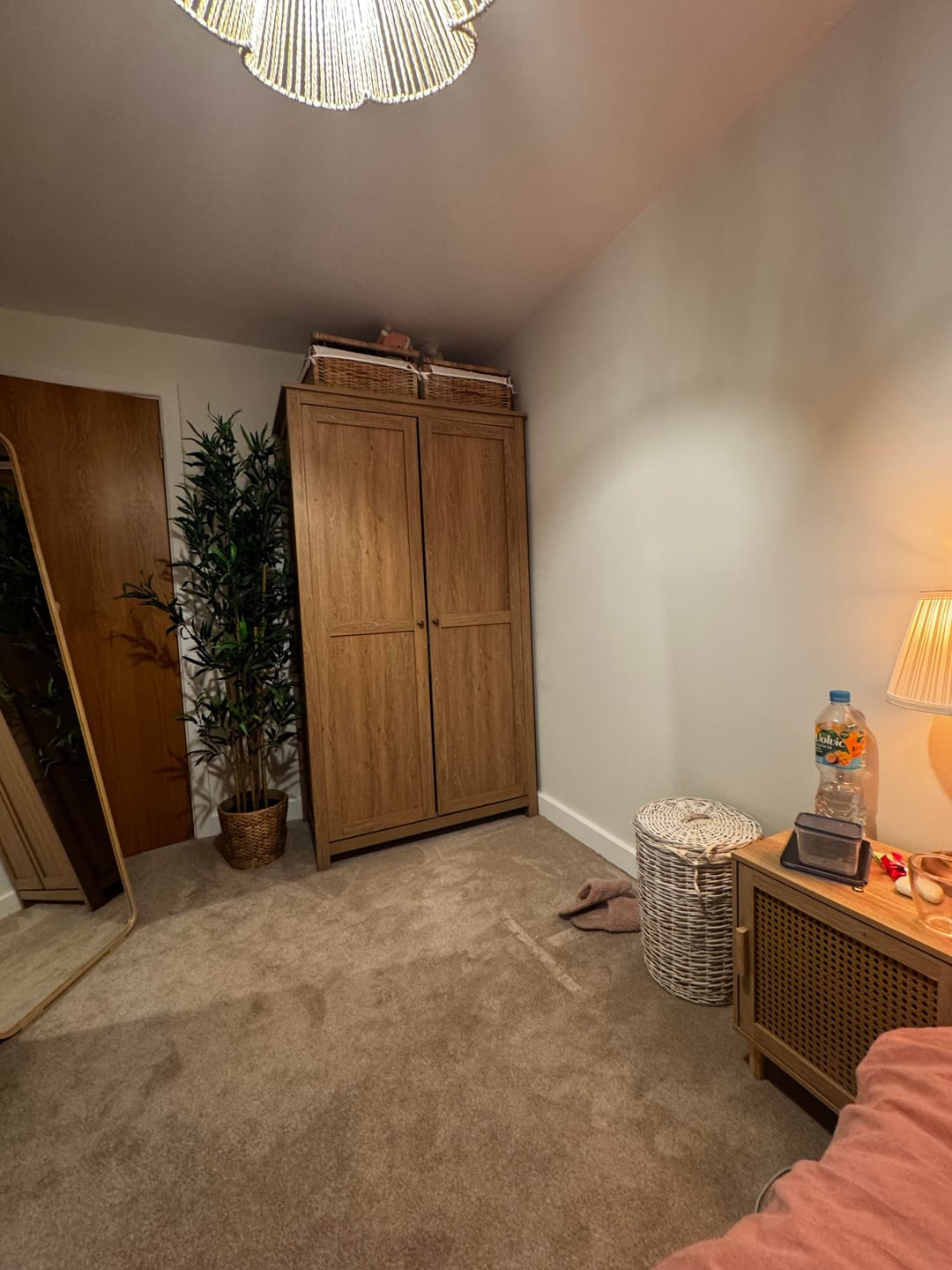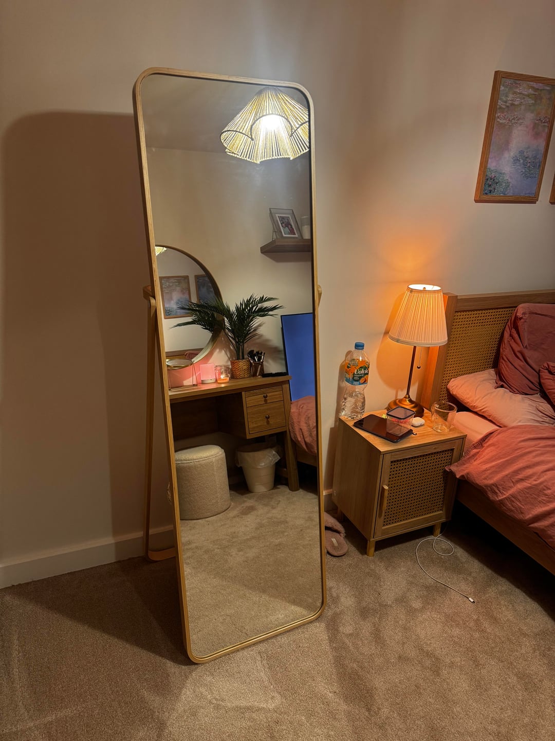 I’d love some suggestions for what i could do with this new open space in my room. I’m getting rid of this giant mirror since i’ve just put up a big enough one on the wall opposite, but now the space looks really empty. I thought about moving the tree next to my bedside table but i don’t like the look. I think it’s mainly the wall that’s bothering me, but i wouldn’t know what to put on it that wouldn’t look odd next the the art i have above my bed. Unless it just seems too spacious and blank to me since i’m not used to it yet? Would love your thoughts!