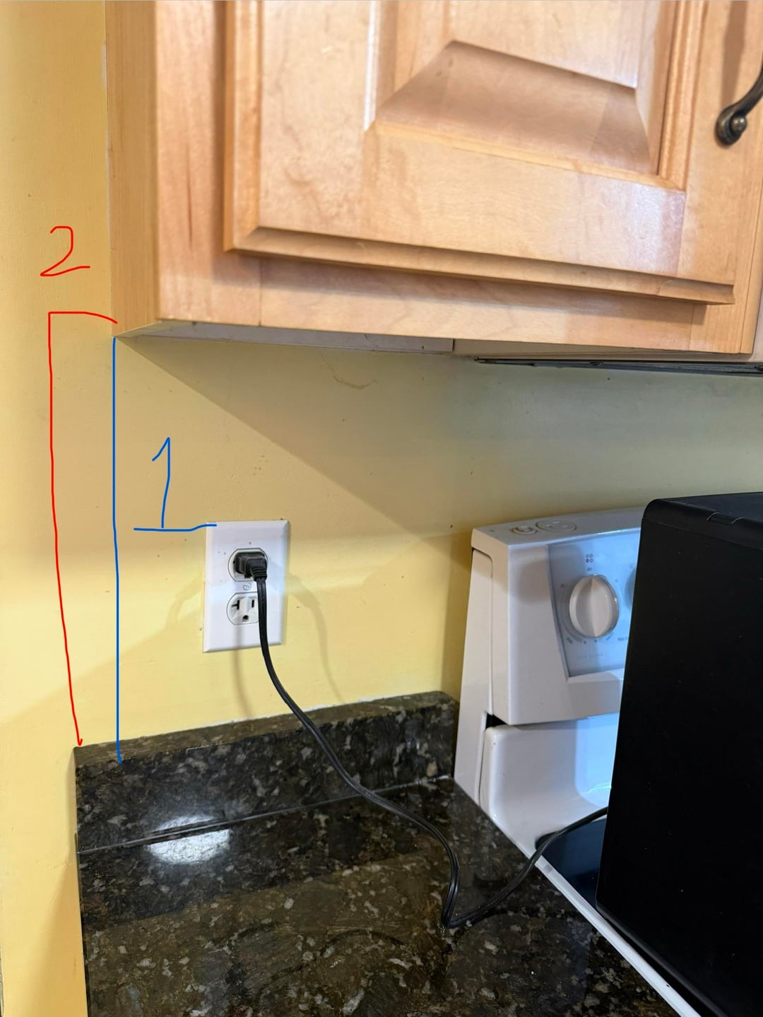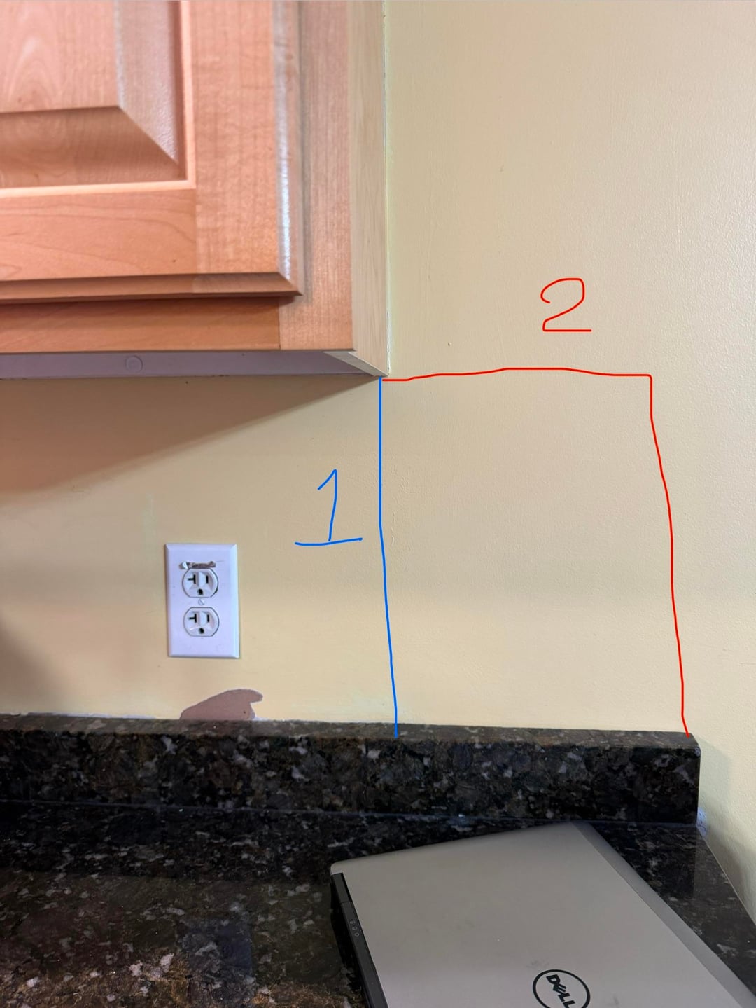 Hi all. My husband and I are finally putting a backsplash in our kitchen. We're wondering how far we should run the backsplash. The counters and cupboards don't line up evenly, so we don't know if we should line the backsplash up with the cupboards (#1 in both pictures) or the counters (#2 in both pictures).